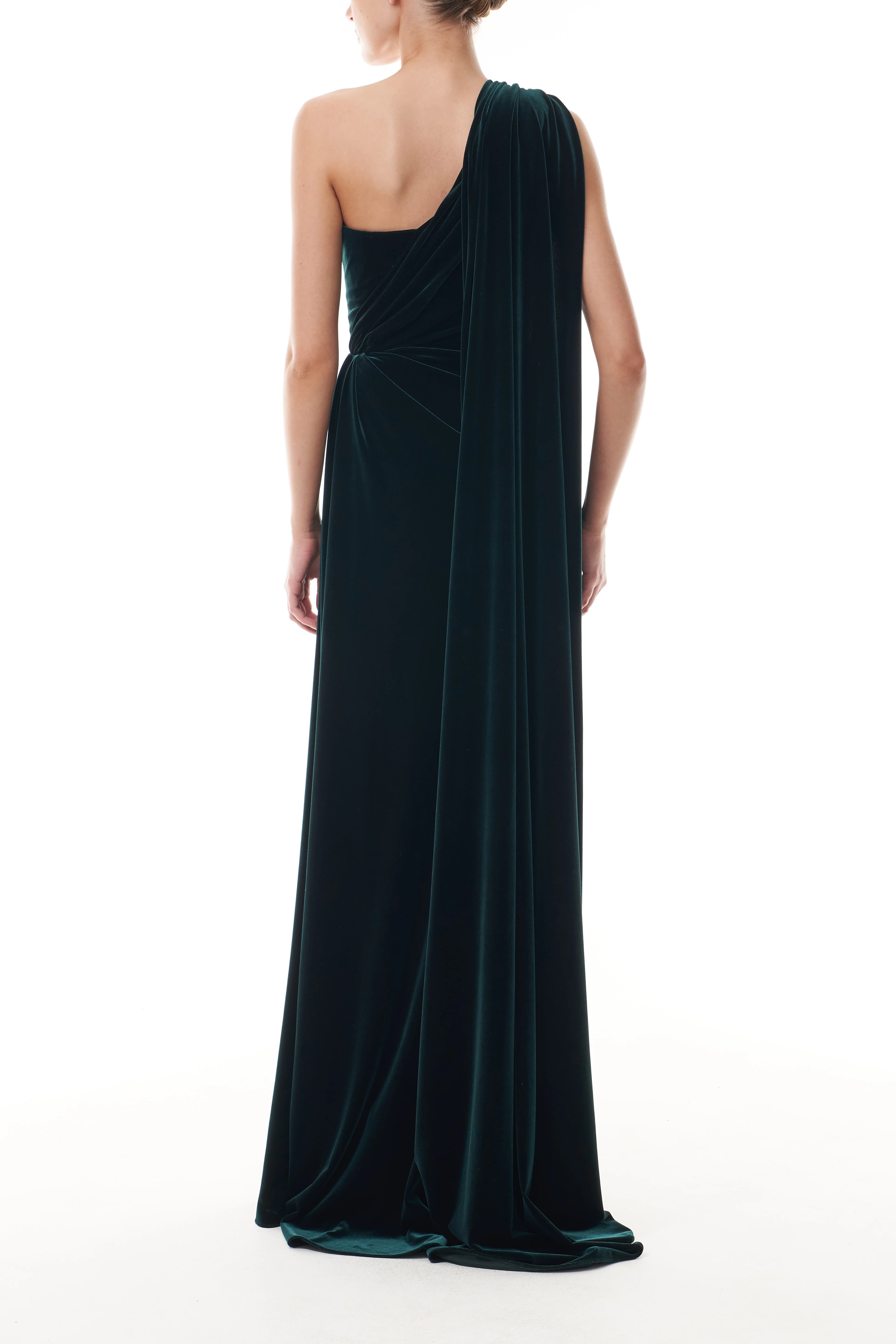Our One Shoulder Deep Green Velvet Gown is a striking silhouette in deep green stretch velvet. Sculpted with asymmetrical draping, the design features a sweetheart bodice on one side, while the opposite shoulder is adorned with a gathered drape that extends into a flowing streamer. The draping meets at the waist and cascades down the length of the skirt, enhancing the column shape. Floor-length and statuesque, this gown exudes graceful drama from every angle.