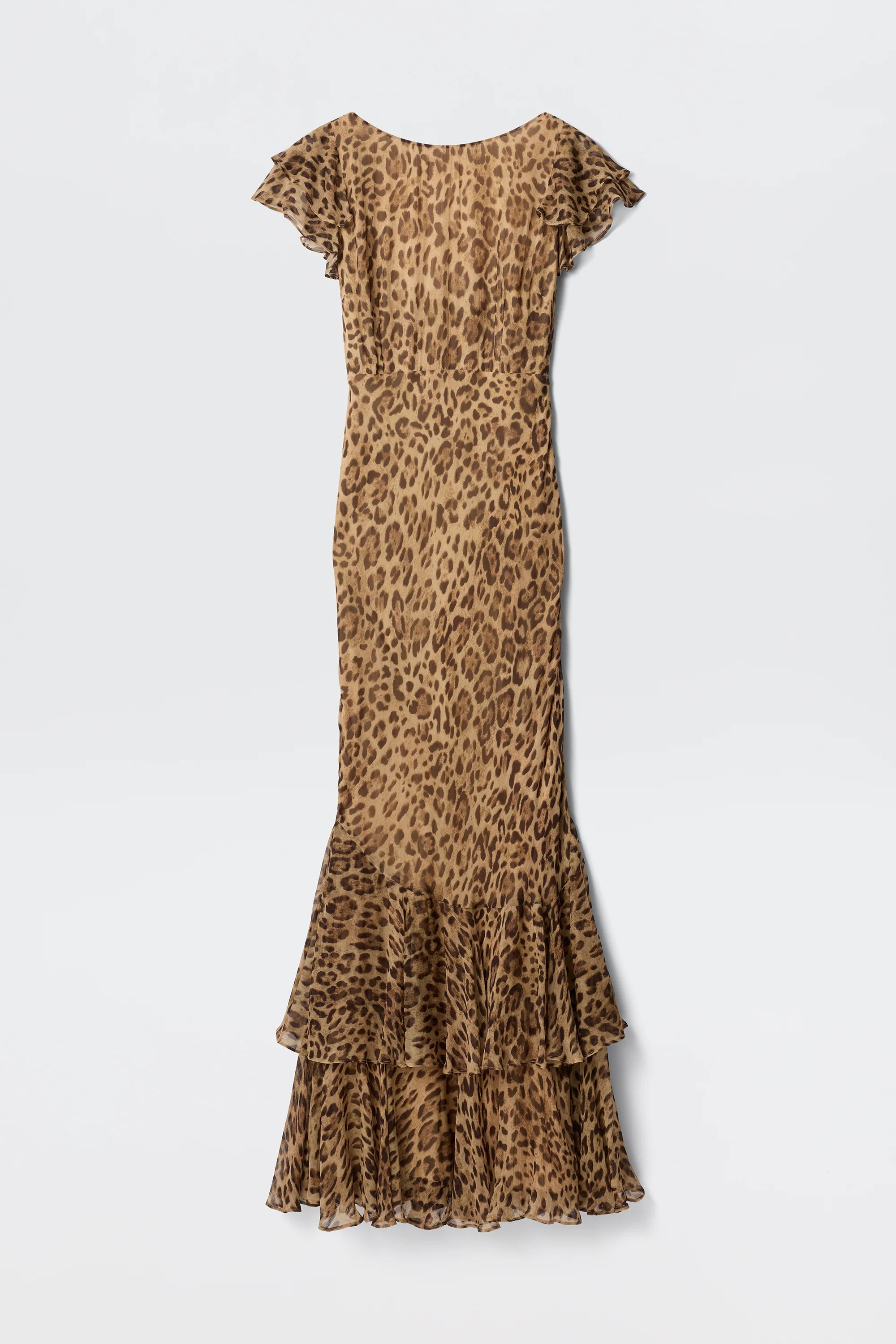 Our most-loved Ordinia gown is a classic, made for life's special moments. 1930s-inspired, it has with a modest low back and romantic ruffles, combining opulence and ease. Now in our new neutral, Mila Leopard print, it’s the ultimate style for black-tie weddings to theatre nights out.