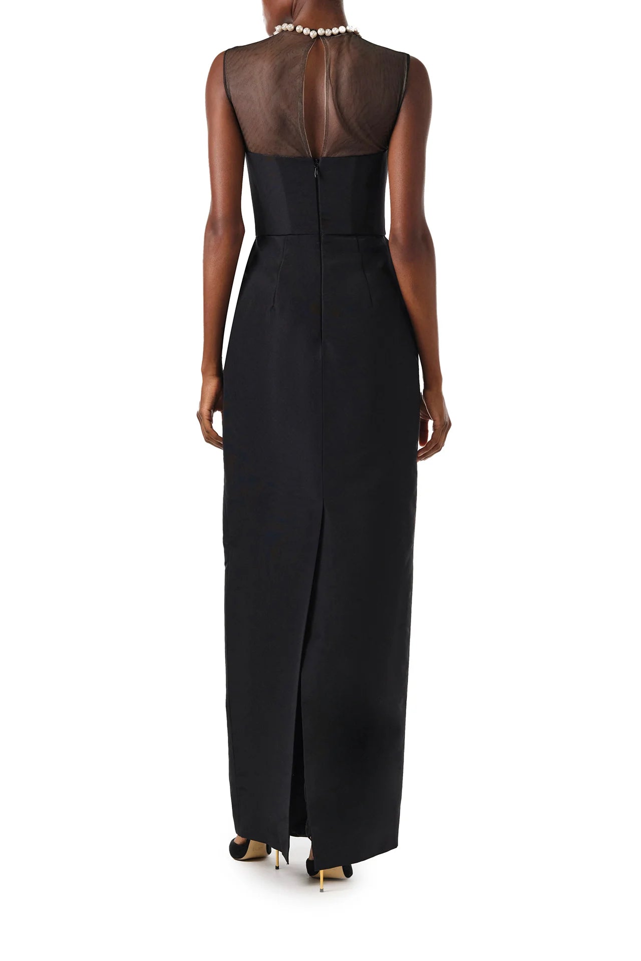 Exuding elegance and refinement. our Pearl Neckline Column Gown is crafted from Noir silk faille. The sleeveless design features a structured bodice with a straight-across neckline that transitions into sheer illusion tulle. adorned with embroidered pearls that mimic the look of a layered necklace. A delicate keyhole at the back. secured with a hook-and-eye closure. adds subtle detail. while the natural waist seam gives way to soft pleats. introducing a touch of volume before tapering into a sleek column skirt. Finished with a back slit and discreet pockets. this gown is a classic statement piece.