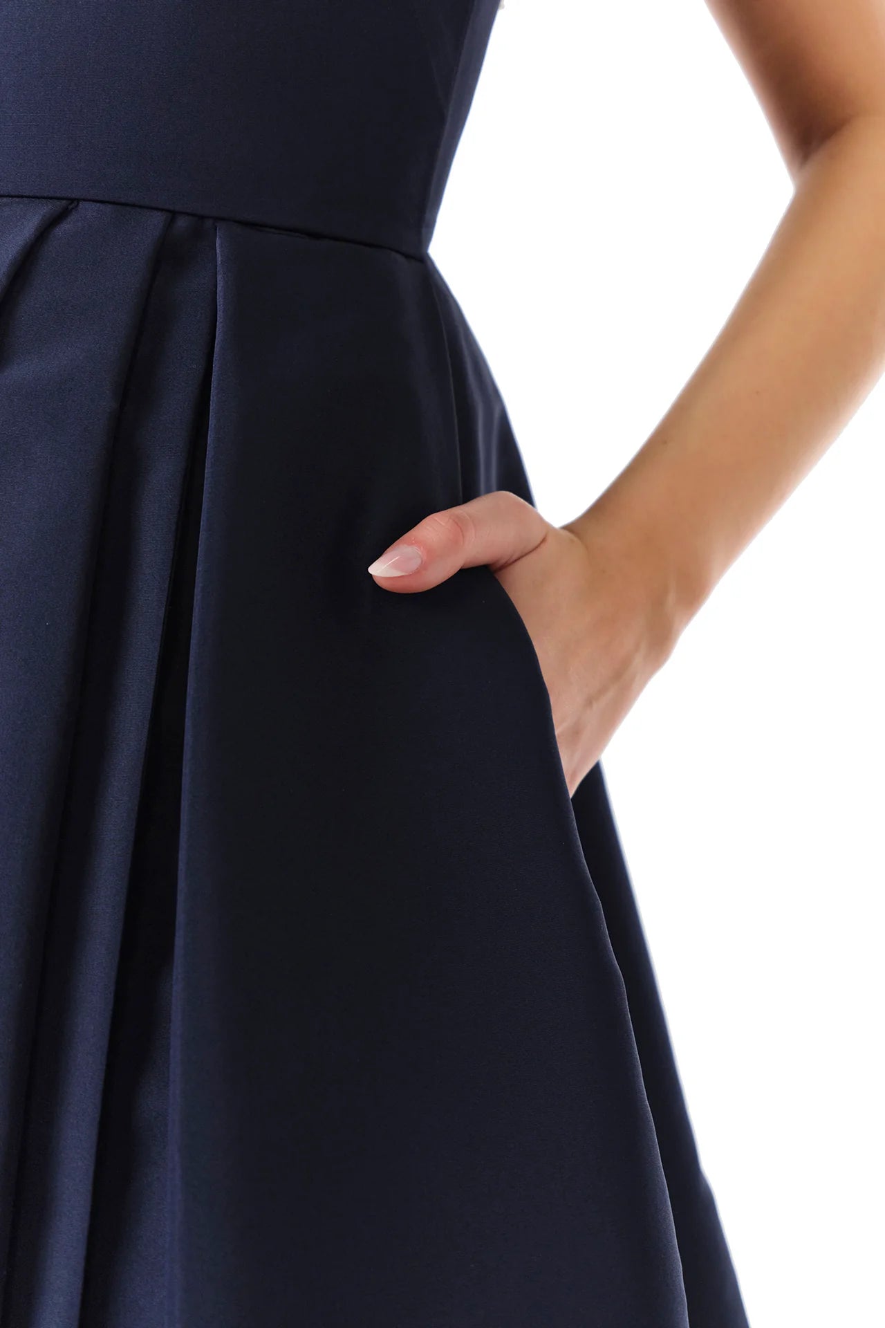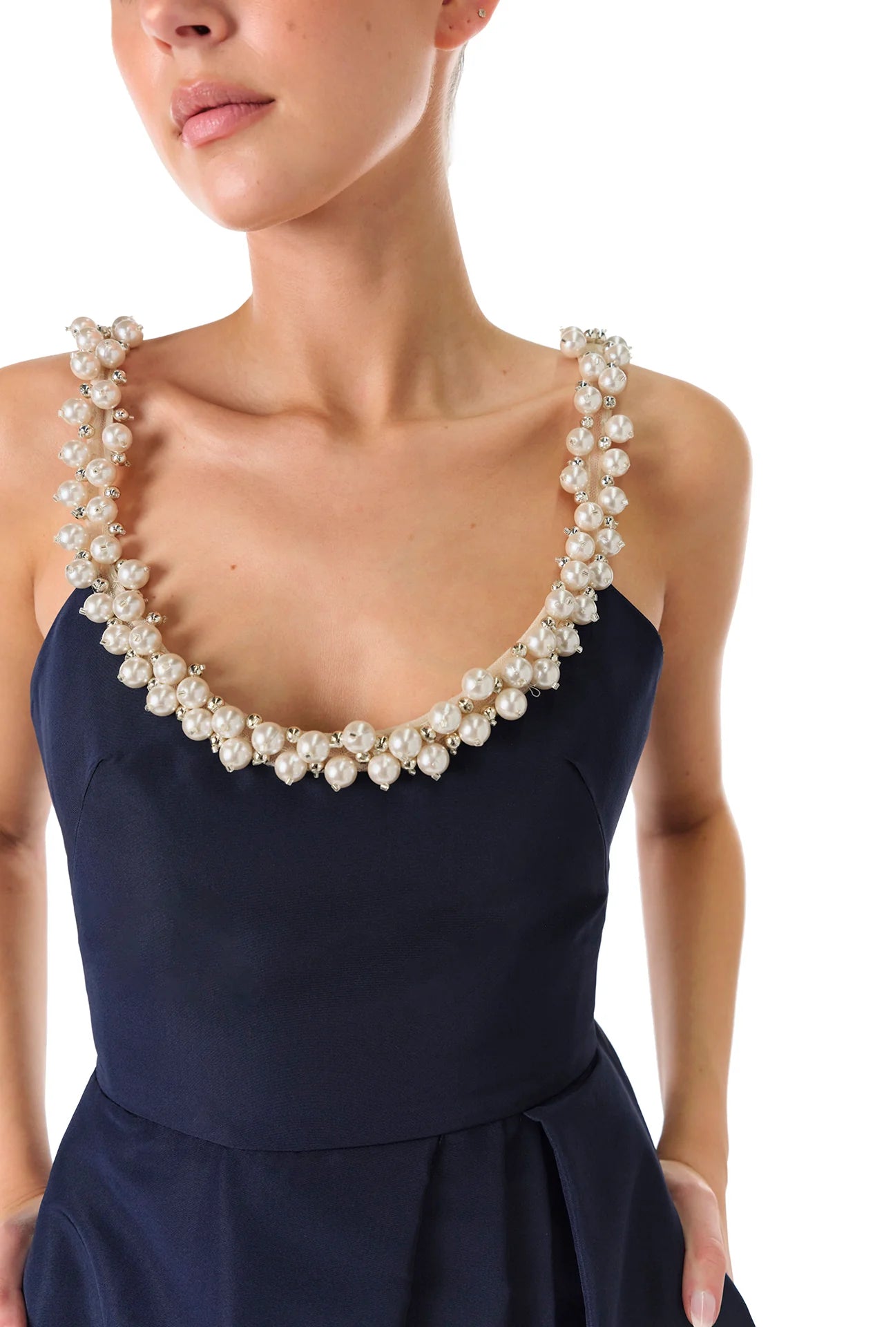 Our Pearl Scoop Neck Gown in Night Sky exudes refined elegance with its sculpted silhouette and intricate detailing. Crafted from luxurious faille. this sleeveless ballgown features a gracefully scooped neckline adorned with delicate pearl embroidery that continues along the straps and low scoop back. Thoughtfully placed pleats at the skirt add volume and dimension before opening into a dramatic front slit. A defined waist seam enhances the silhouette. while dpockets offer a modern touch. Finished with a floor-length skirt and subtle train. this gown is a stunning balance of structure and romance.