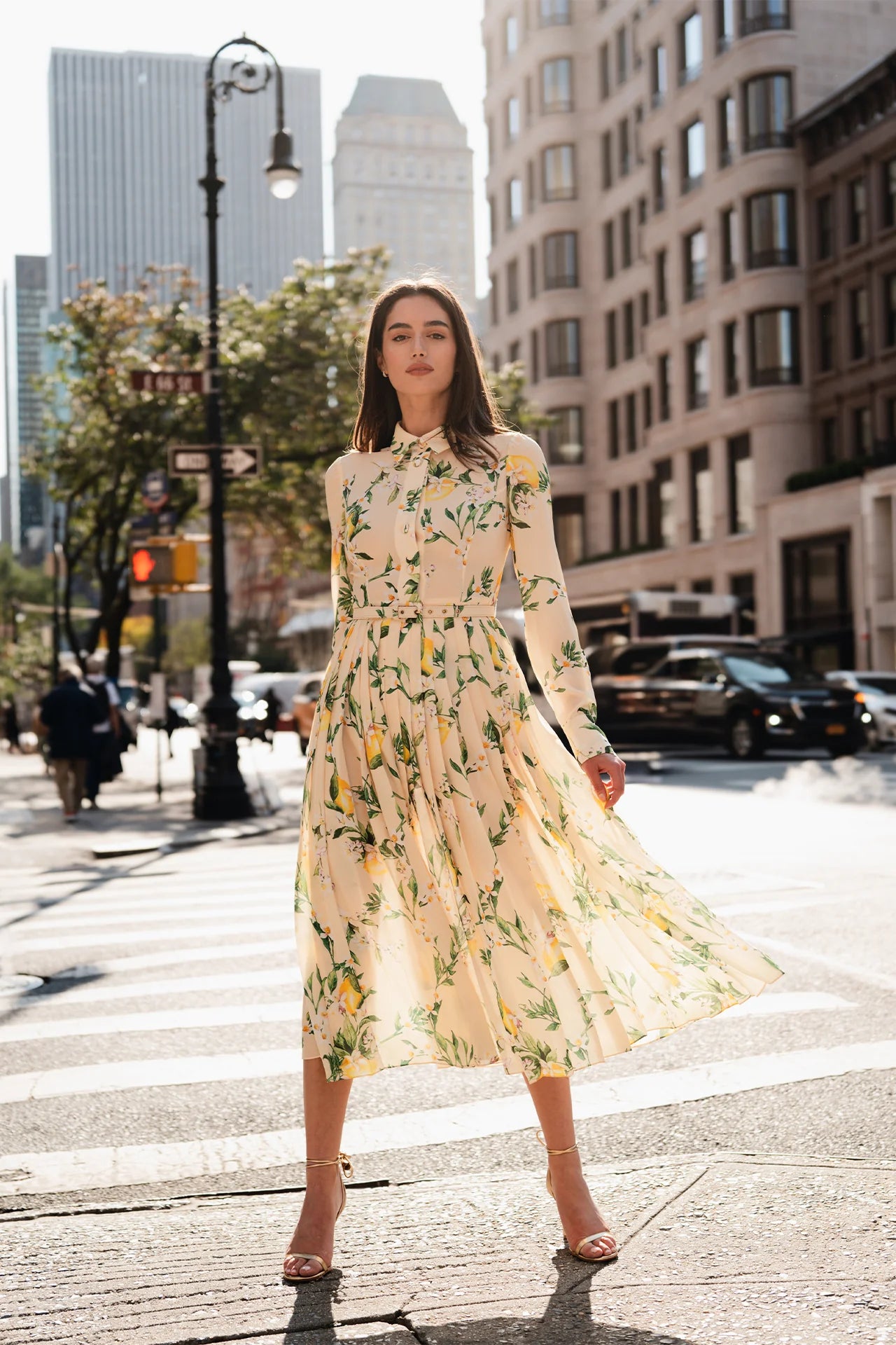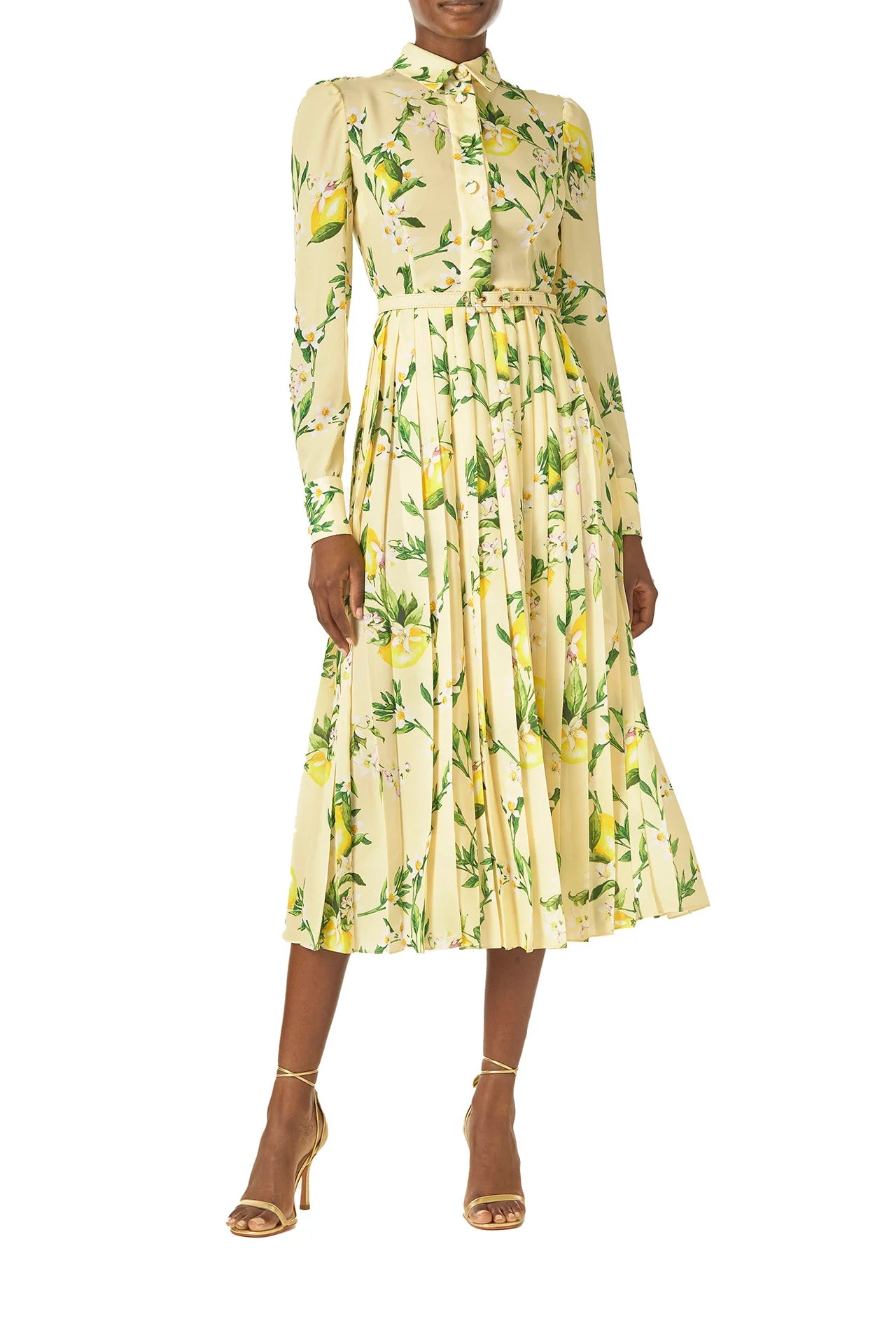 Fresh and refined. the construction of our Long Sleeve Pleated Button-Down Dress is beautifully juxtaposed with a vibrant Lemon printed georgette. A tailored button-up bodice with collar. belted natural waist. and flowing pleated skirt create a flattering silhouette. perfectly combining classic tailoring with effortless style.