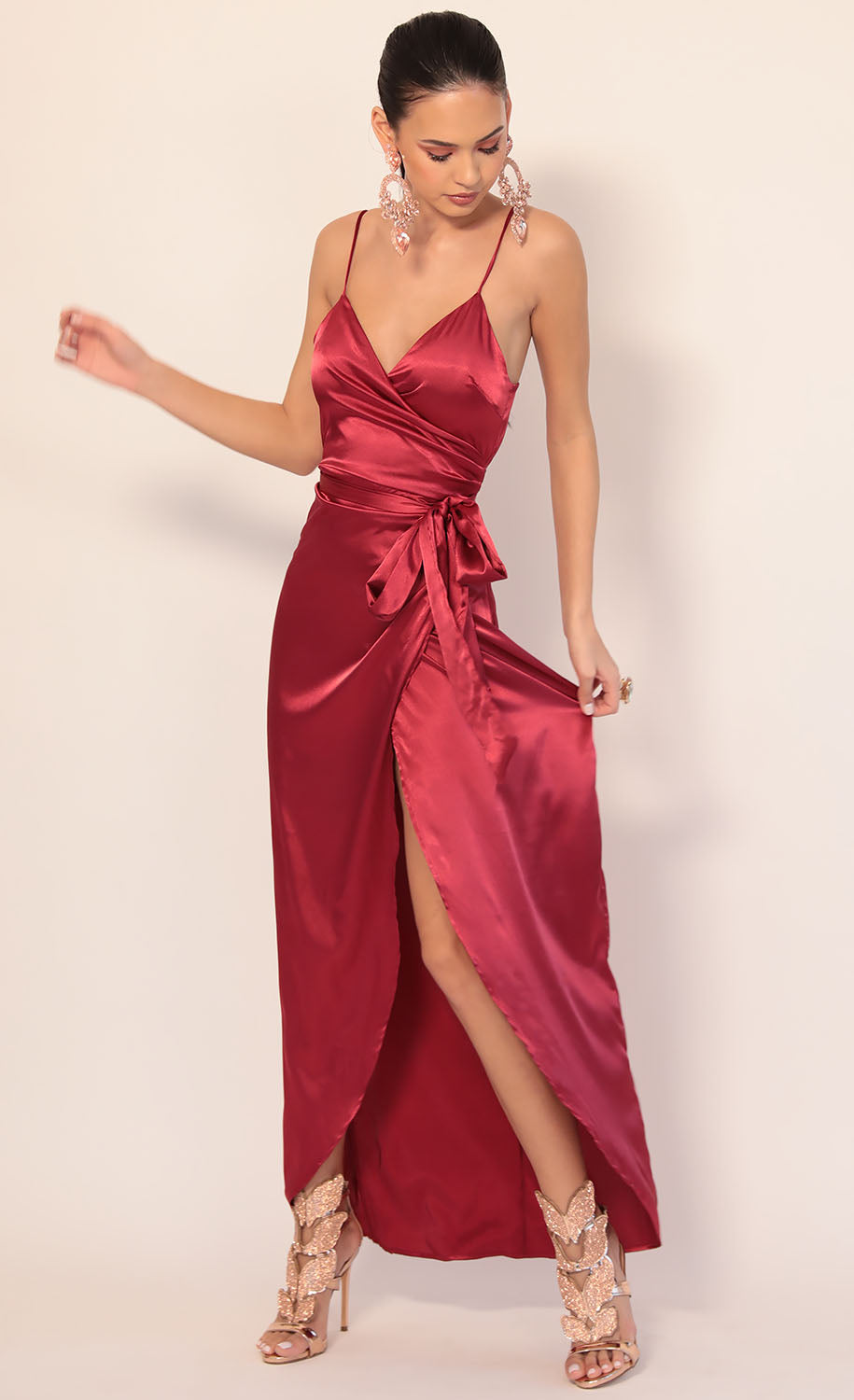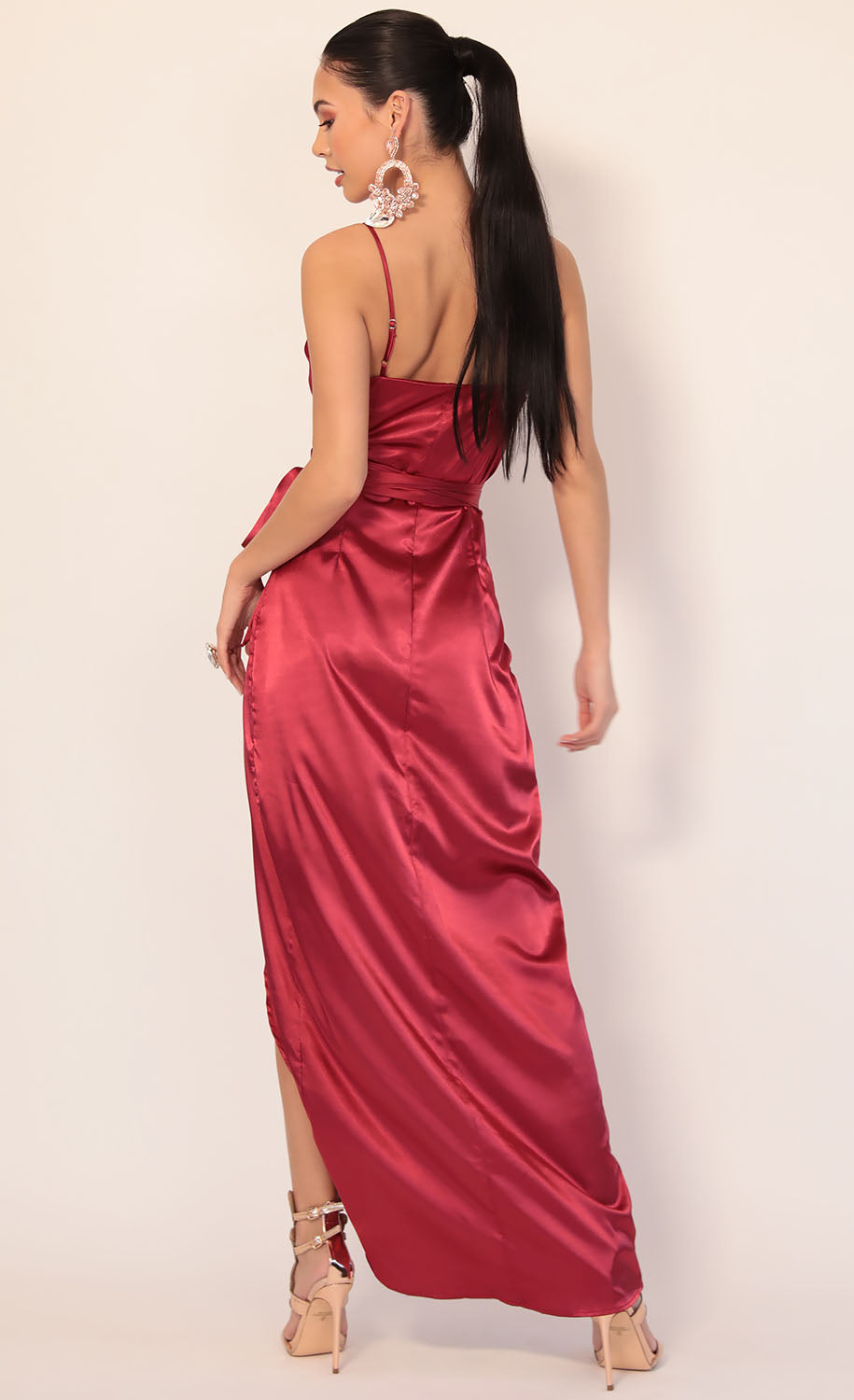 This classy satin maxi dress is breath-taking. Carefully sewn and pleated in our luxurious red burgundy satin charmeuse. Perfect for many occasions year-round, from date night to formal or prom. Features a sexy cross-over sweetheart neckline, adjustable straps and a tie to accenuate the waist. Pair with cute heels and clutch and all eyes are on you! Made In Los Angeles - Adjustable Straps - 100% Polyester - Tie Included - Ruched Pleated Detailing - Hand Wash Cold All Measurements Are For A Size Small.