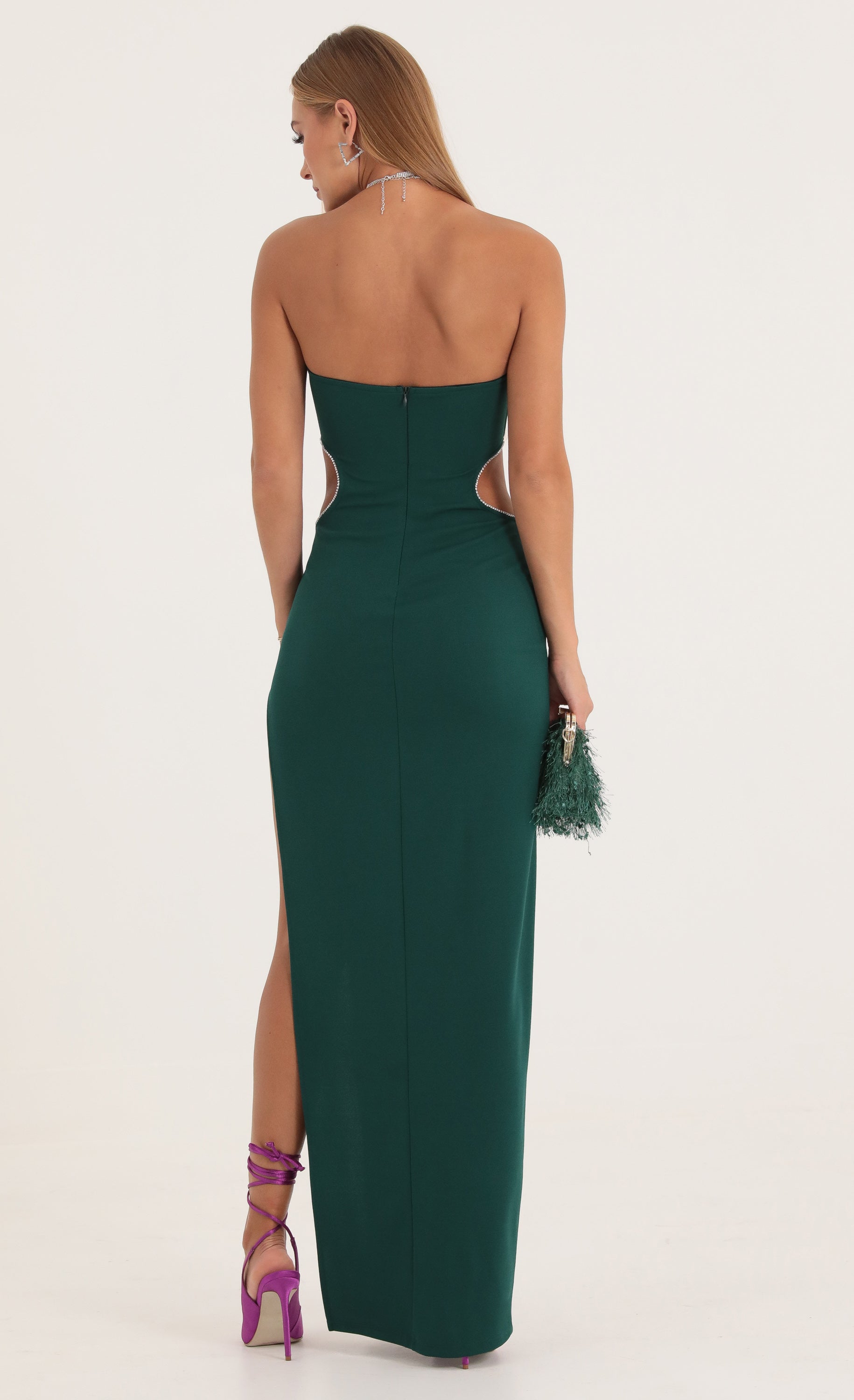 Designed in Los Angeles - Dress Unlined - Zipper Back Closure - Hand-Wash Cold - Rhinestone Detailing - Made in Techno Crepe Fabric Length of Dress Measures 57in/144.7cm All Measurements Are For A Size Small Handling the garments with care, hand washing and air drying is strongly recommended. Slight modifications might be made to improve garment quality.