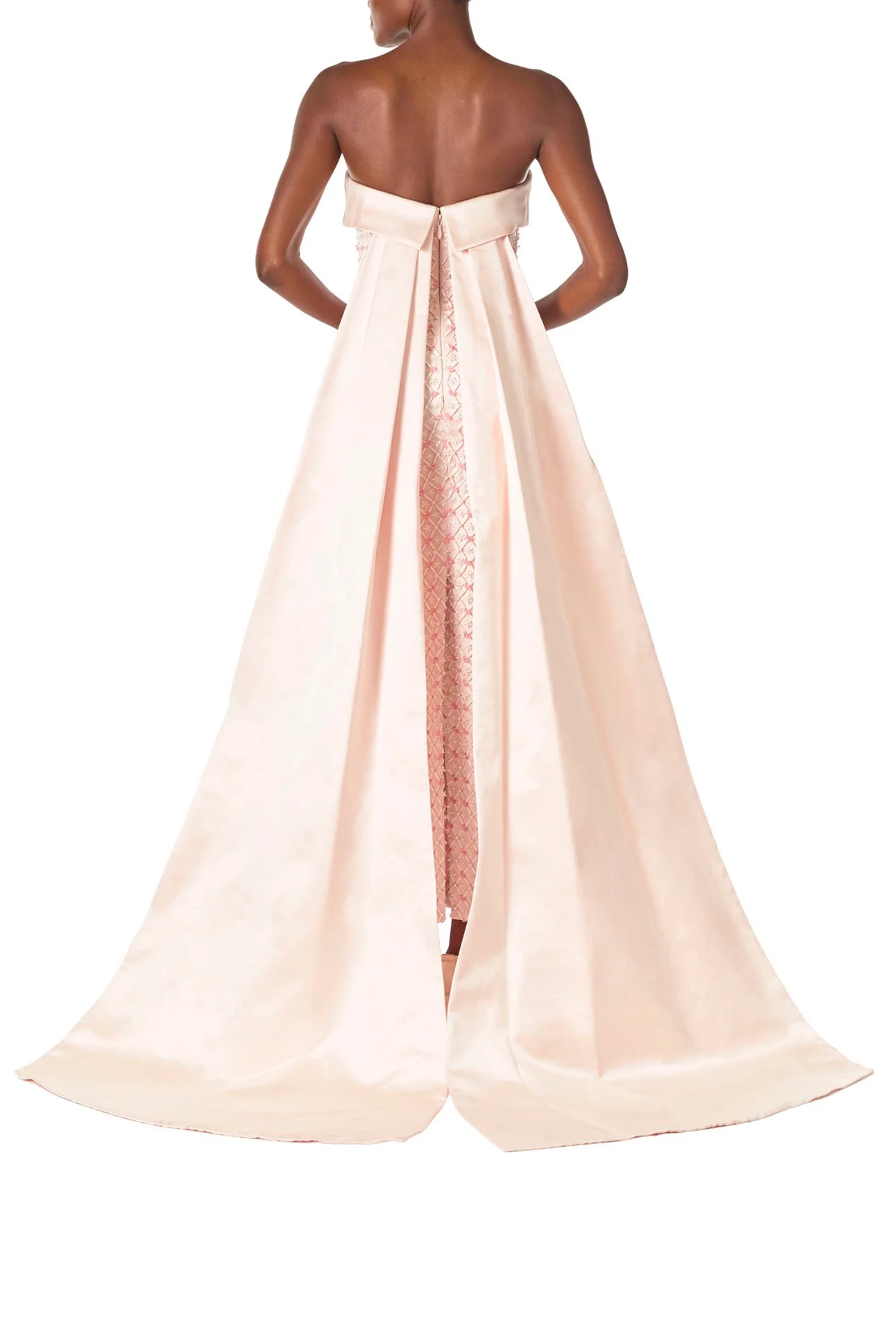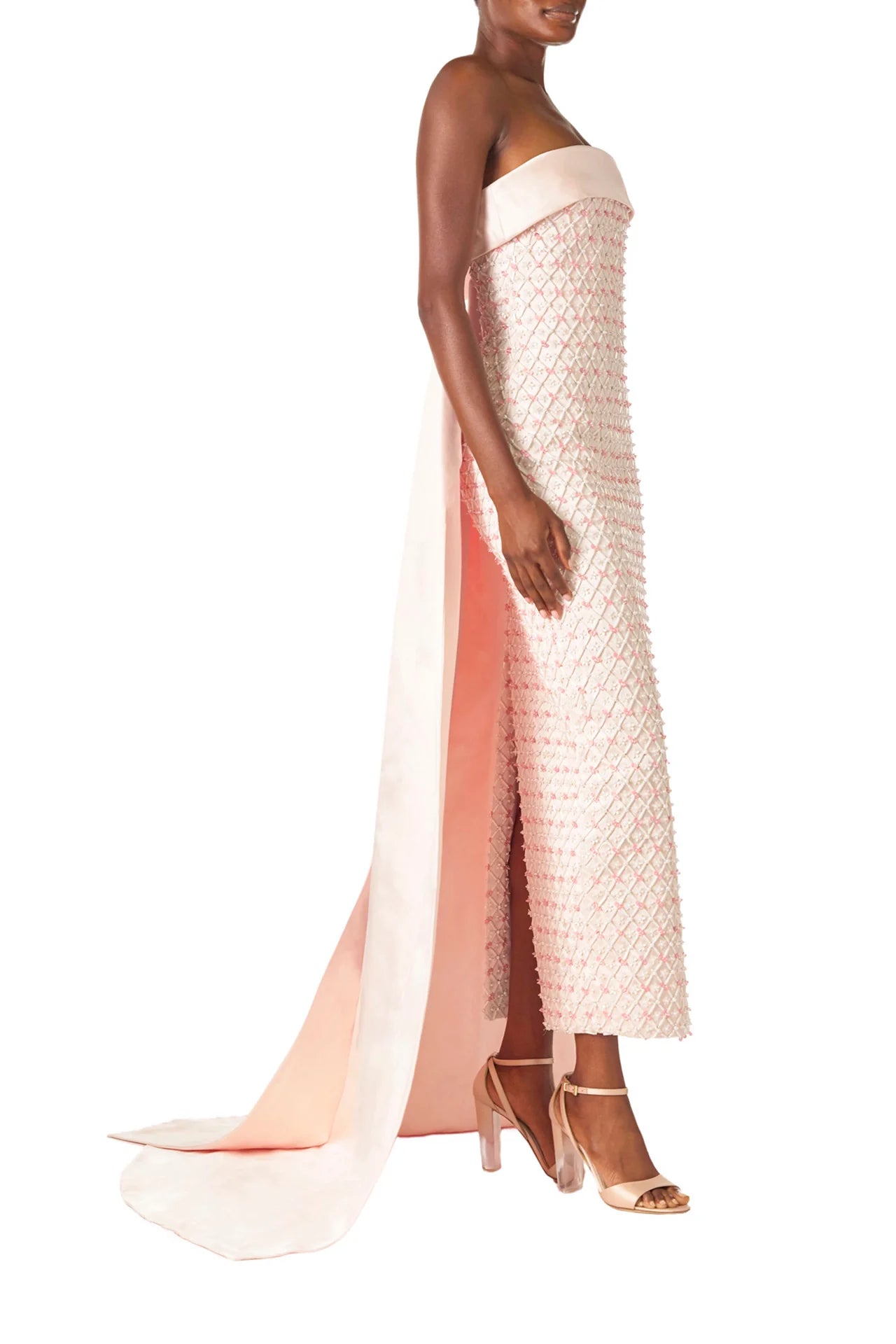 Our Rosé Beaded Satin Gown is crafted from luxurious embroidered duchess satin in a soft shade of rose. The vertically boned strapless bodice features a satin cuffed neckline. while delicate bugle bead embroidery adds intricate detail throughout the column silhouette. A satin integral draped back train flows seamlessly from under the cuff at the back neckline. creating drama and elegance. Finishing at a tea length. this gown blends timeless romance with glamour.