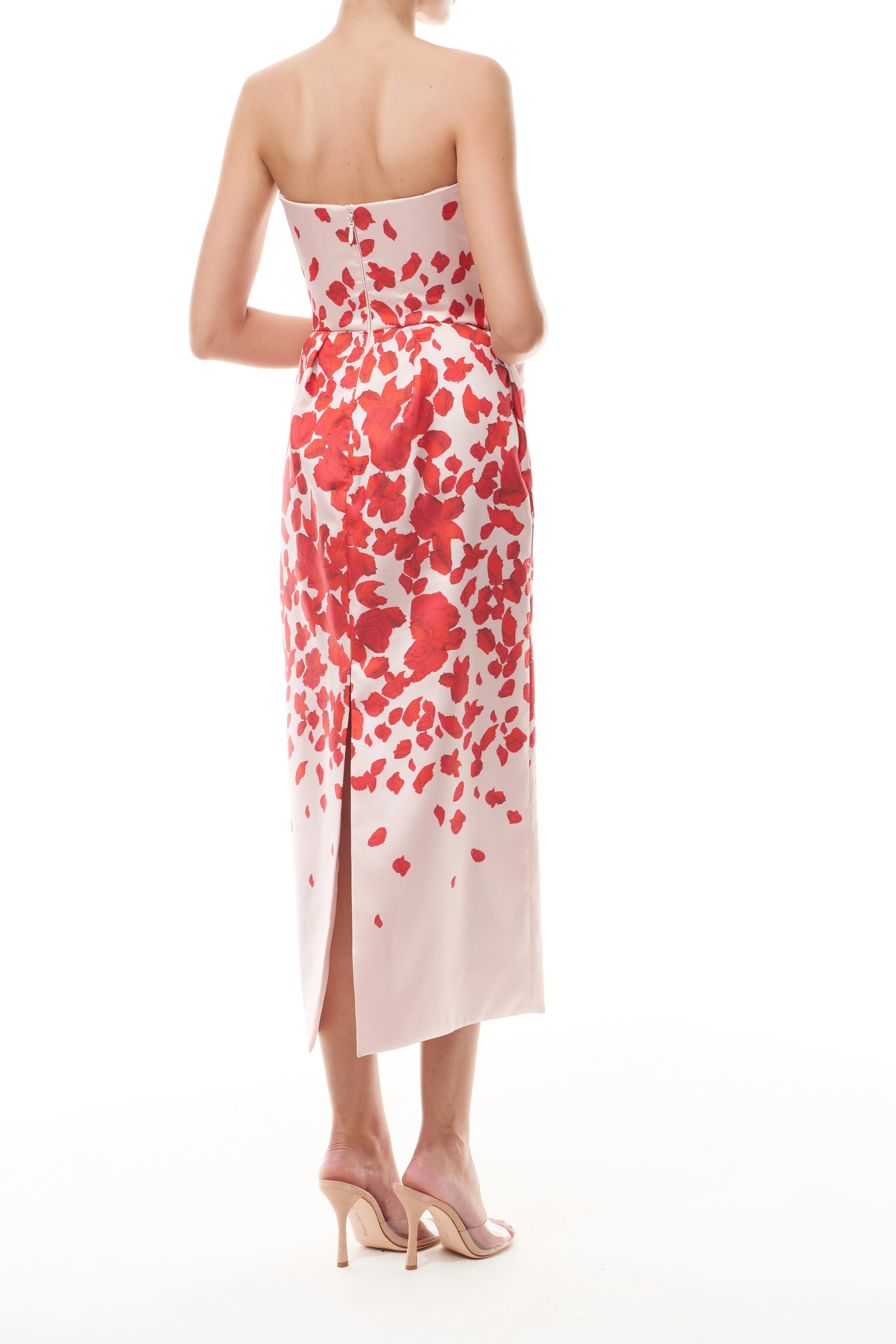 Our Strapless Cocktail Dress in Candy/Multi Rose Petal Printed Mikado showcases a subtly dropped waist with a defined seam for a flattering silhouette. A center front pleat adds subtle volume to the midi-length skirt, while pockets offer practical elegance.