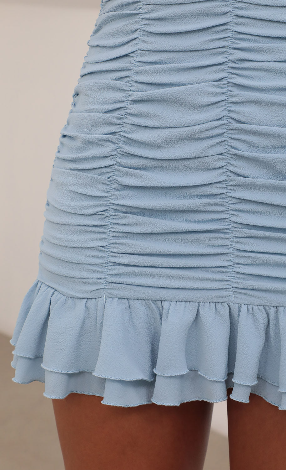 Keep yourself feeling chic and stylish with our new Remi Ruched Bodycon Dress in our baby blue chiffon fabric. With spaghetti shoulder straps, double ruffle hem and unimaginable ruching throughout, this eye-catching dress will meet all your needs. We know this is perfect for summer and beyond, you won't regret it! Made in Los Angeles -100% Polyester -Fully Lined -Back Zipper Closure -Hand Wash Cold Length of Dress Measures 31in/78.7cm All Measurements Are For A Size Small