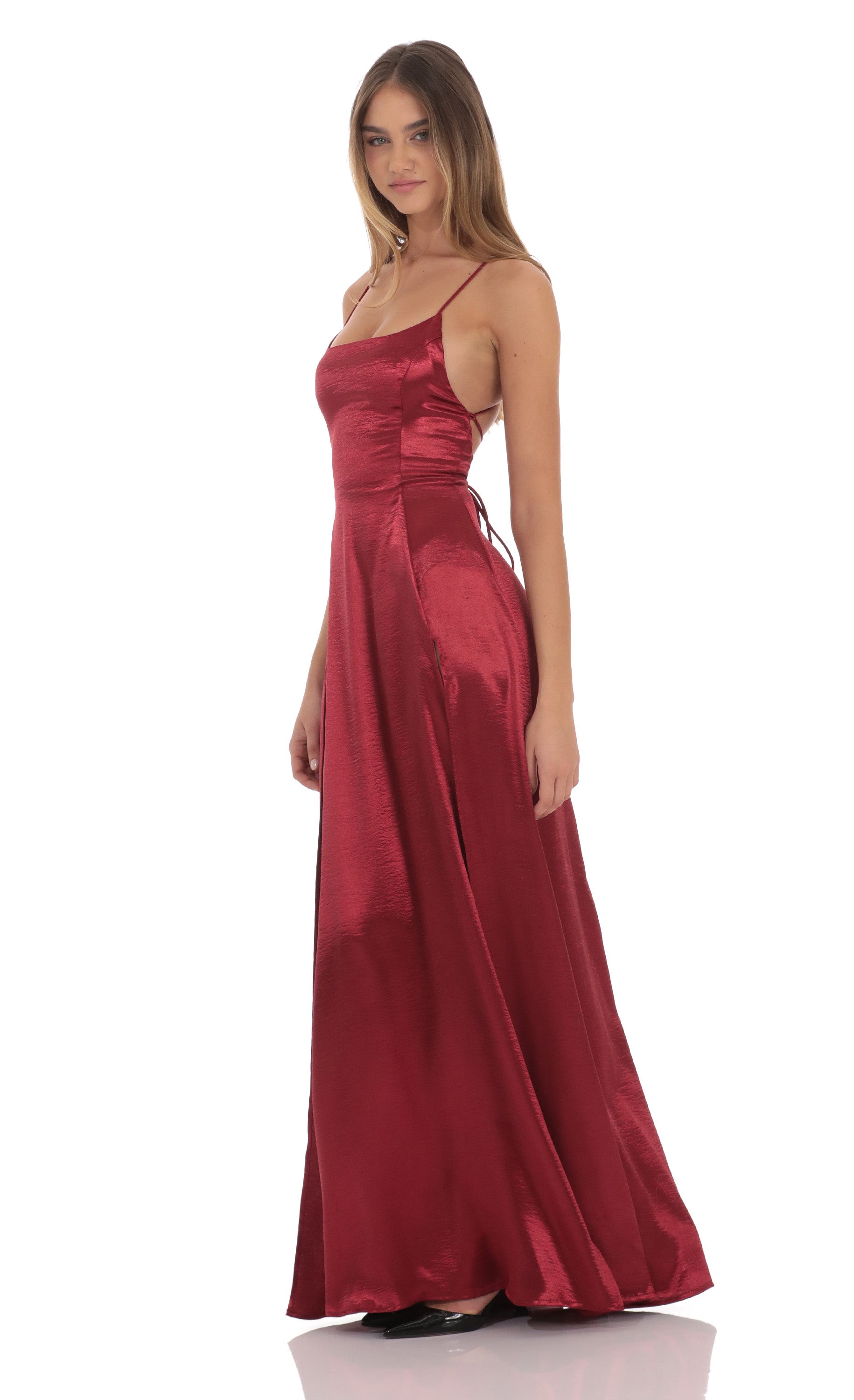 Designed in Los Angeles - Maxi Length - Zipper and back tie closure - Double slit - Unlined - Made in Satin Fabric - Hand wash cold Model is wearing a size small that measures 57in/145cm in length Slight modifications might be made to improve garment quality. Handling the garments with care, hand-washing and air-drying is strongly recommended.