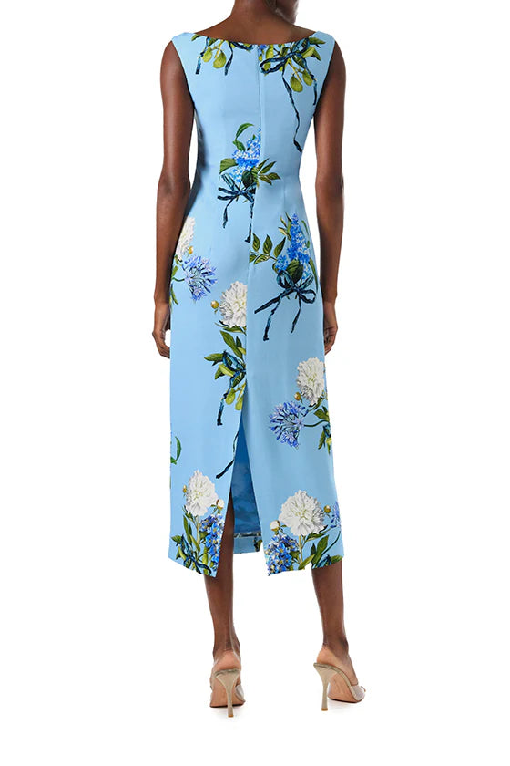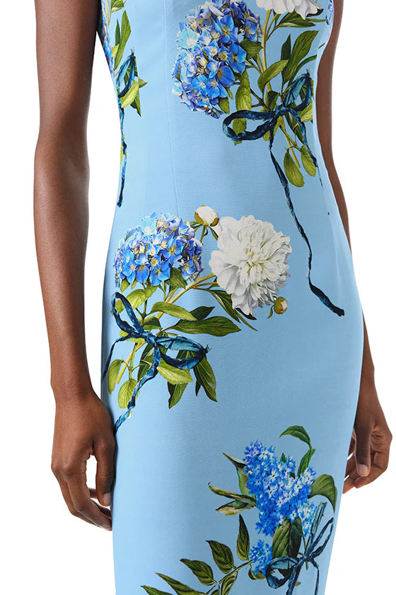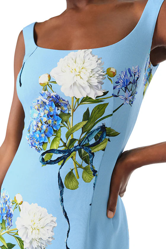 The Scoop Neck Floral Midi Dress exudes timeless elegance with modern sophistication. Designed in Sky Blue Hydrangea Printed Crepe. this sleeveless dress features sculpting princess seams that accentuates the figure. with a delicate scoop neckline that highlights the décolletage. The midi length and column silhouette offer a refined. understated detail. while the bold and feminine print ensure this dress is a showstopper from every angle.