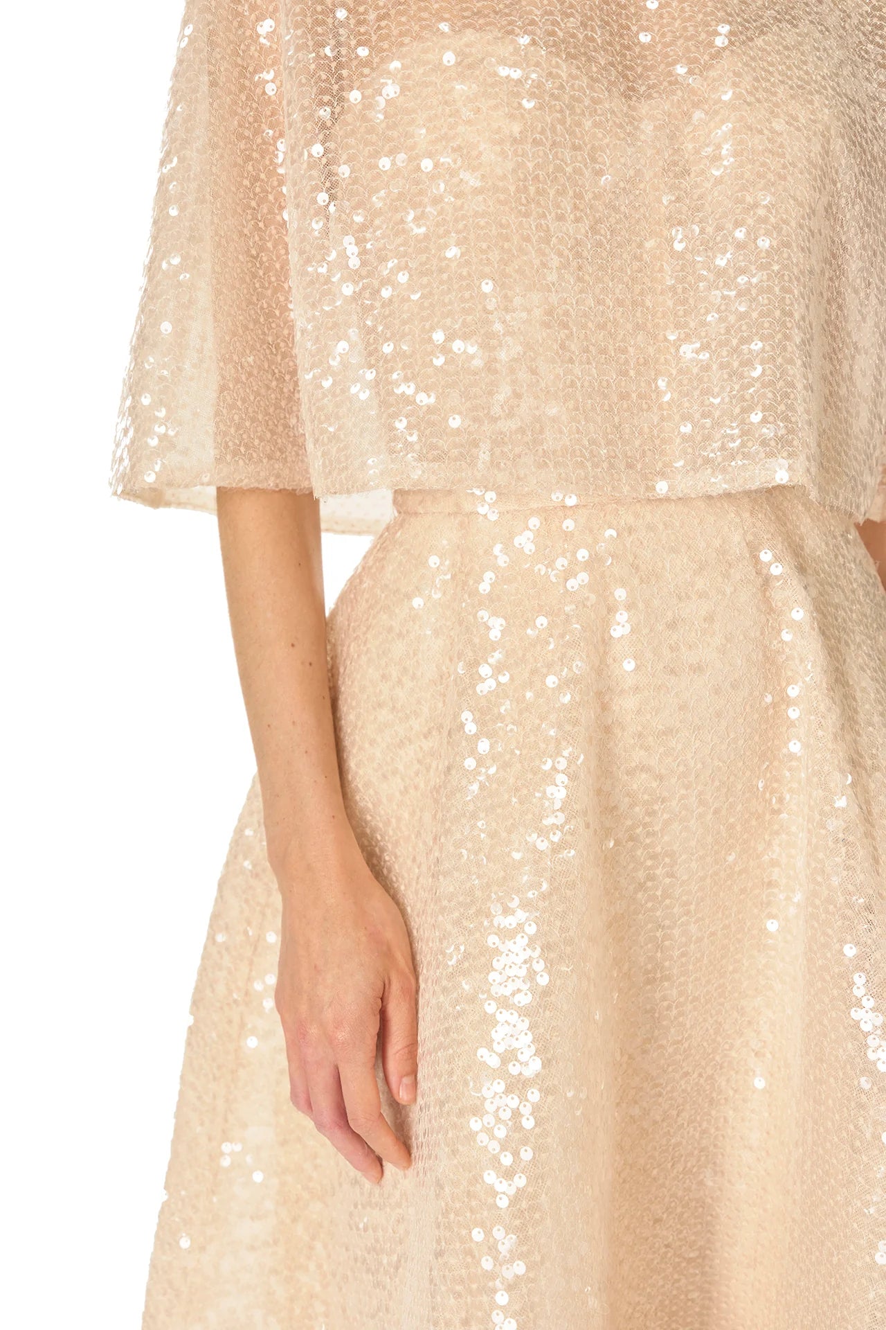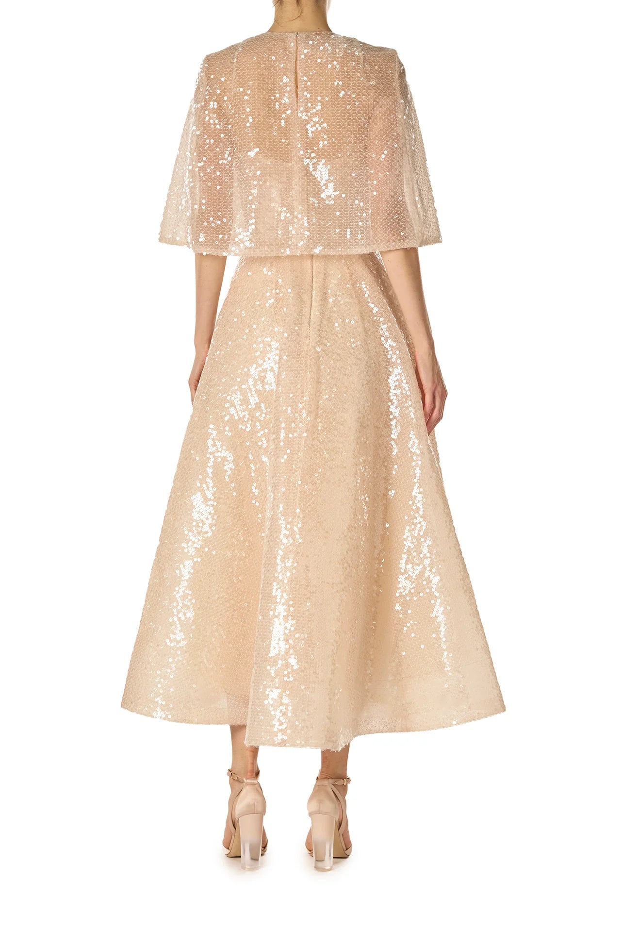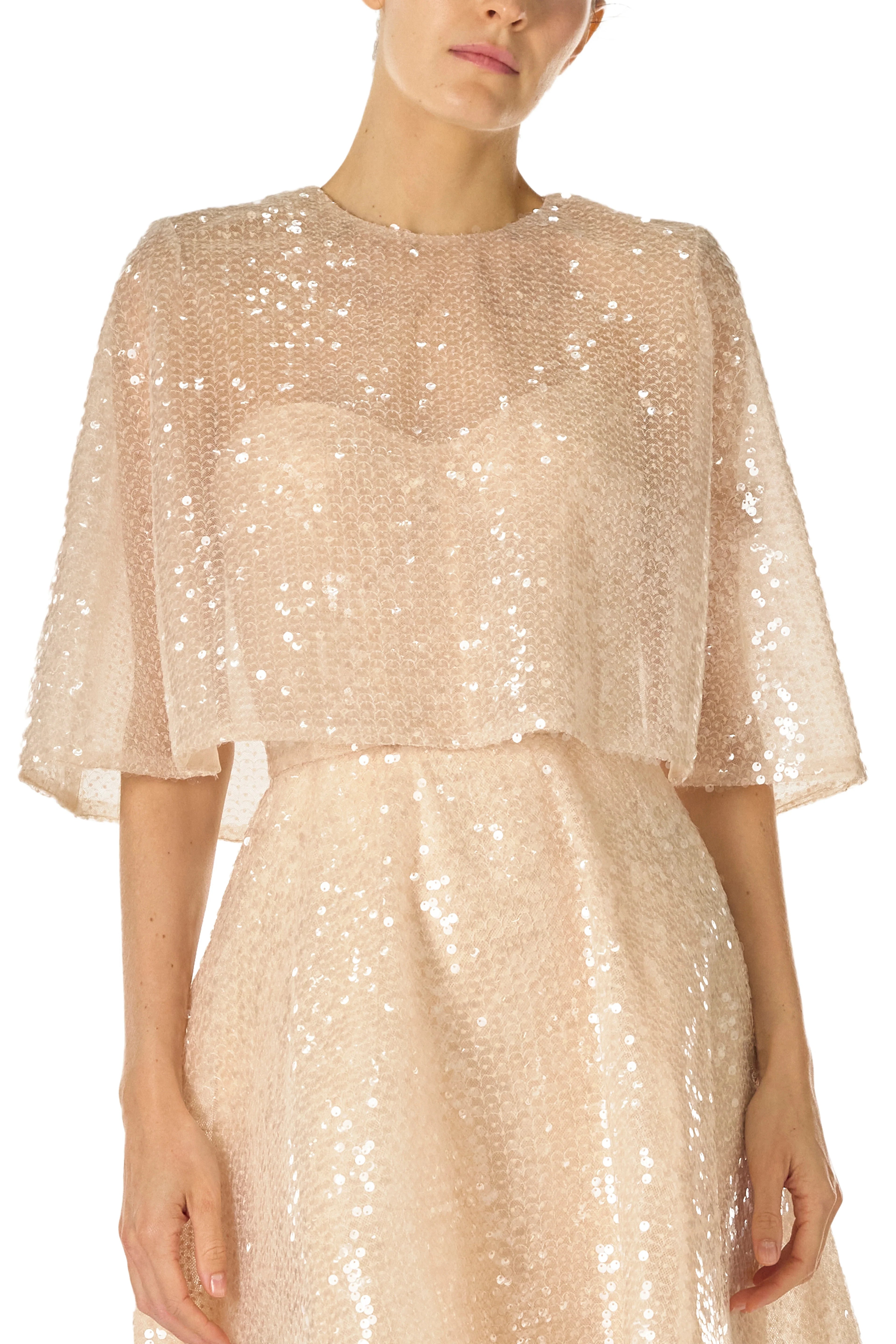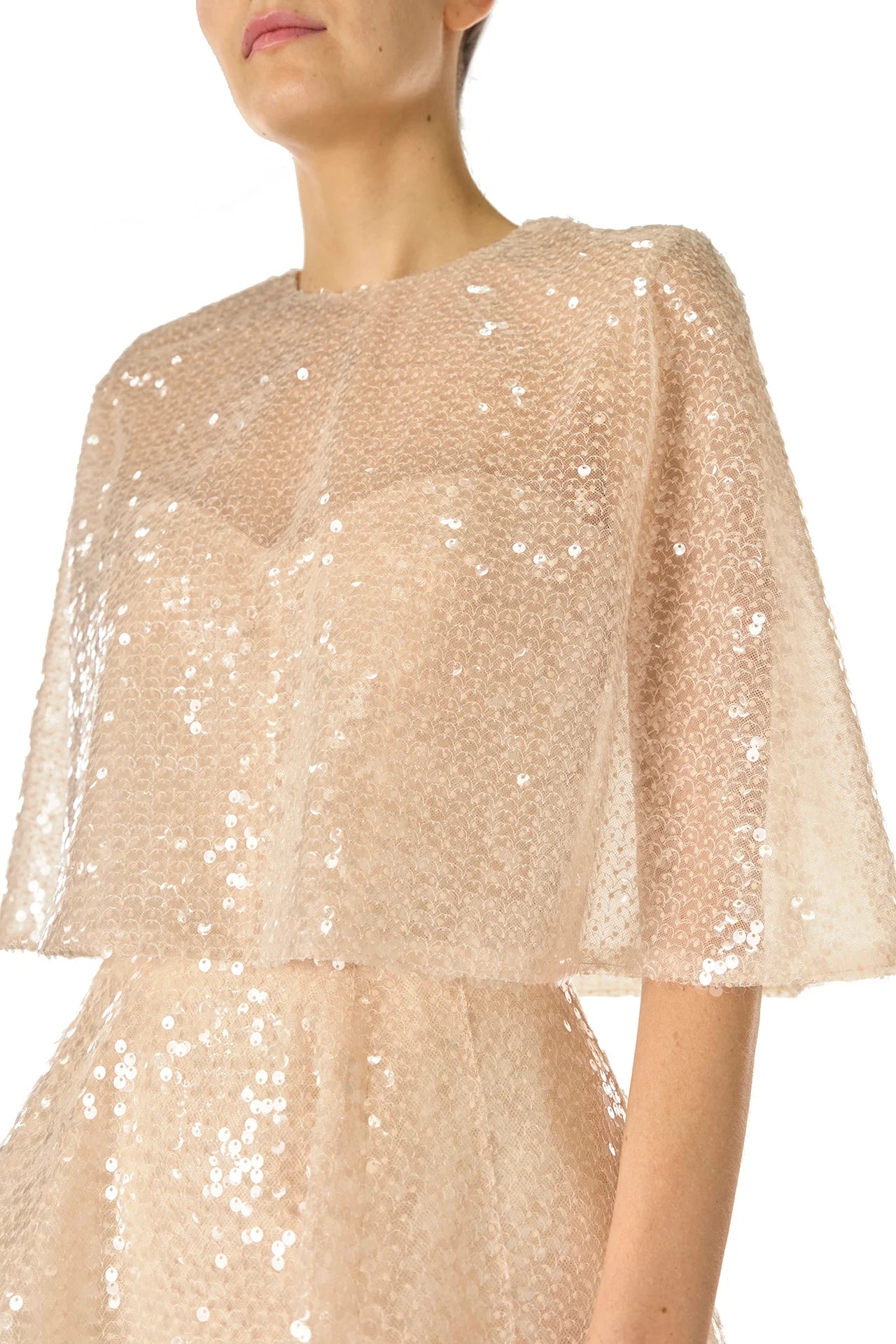 Our Prosecco Sequin Tulle Capelet offers a whisper of coverage without obscuring the beauty of the dress beneath. The shimmering fabric drapes effortlessly. allowing the silhouette of what it is paired with to shine through. With a hook and eye closure at the center back neckline. this feminine and weightless piece adds just the right touch of romance.