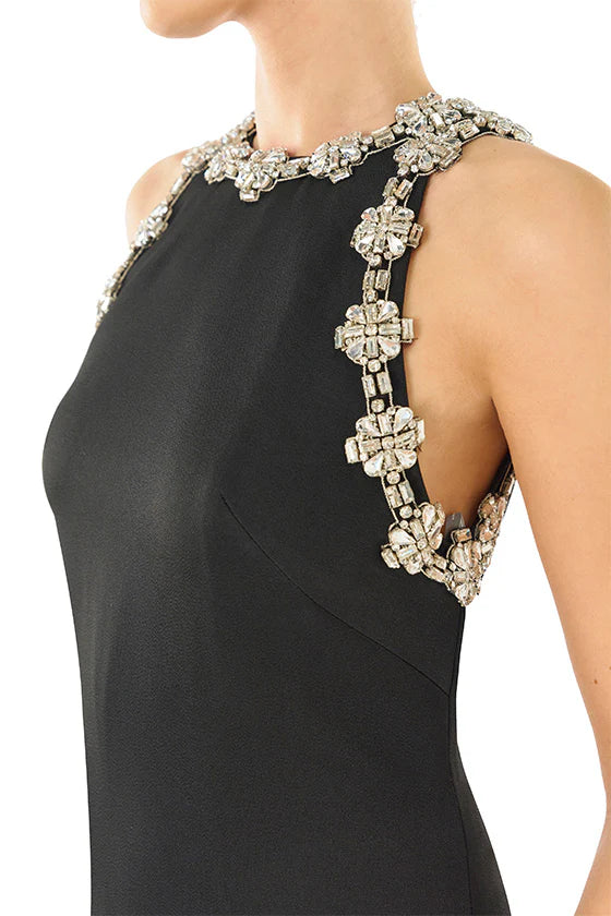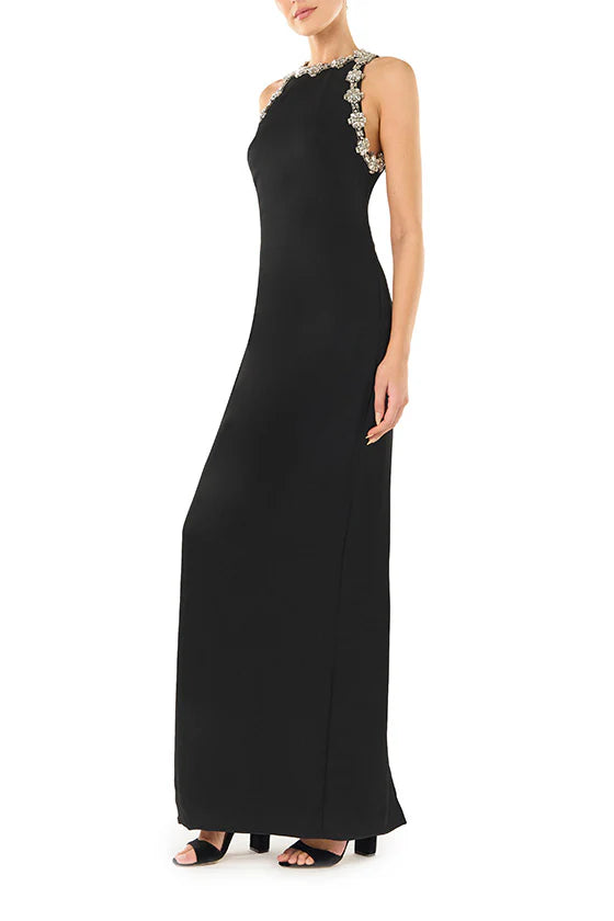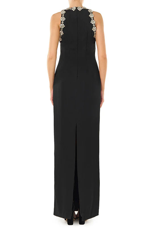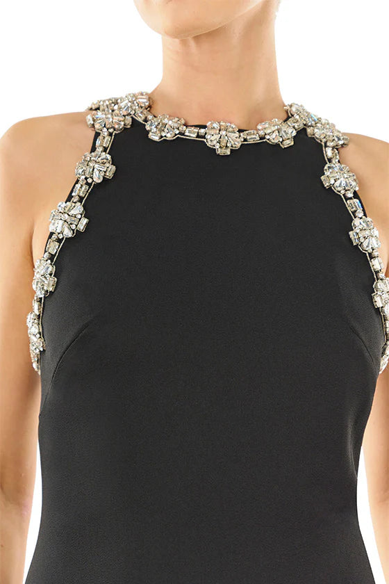 Sleeveless. crepe evening gown with jewel neckline and crystal embroidery detail.