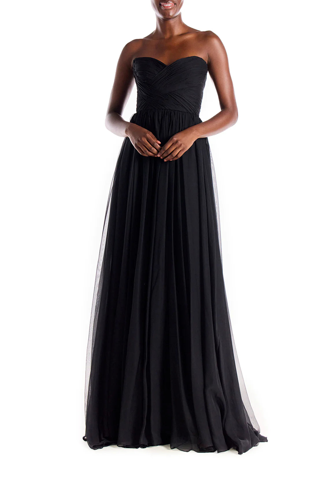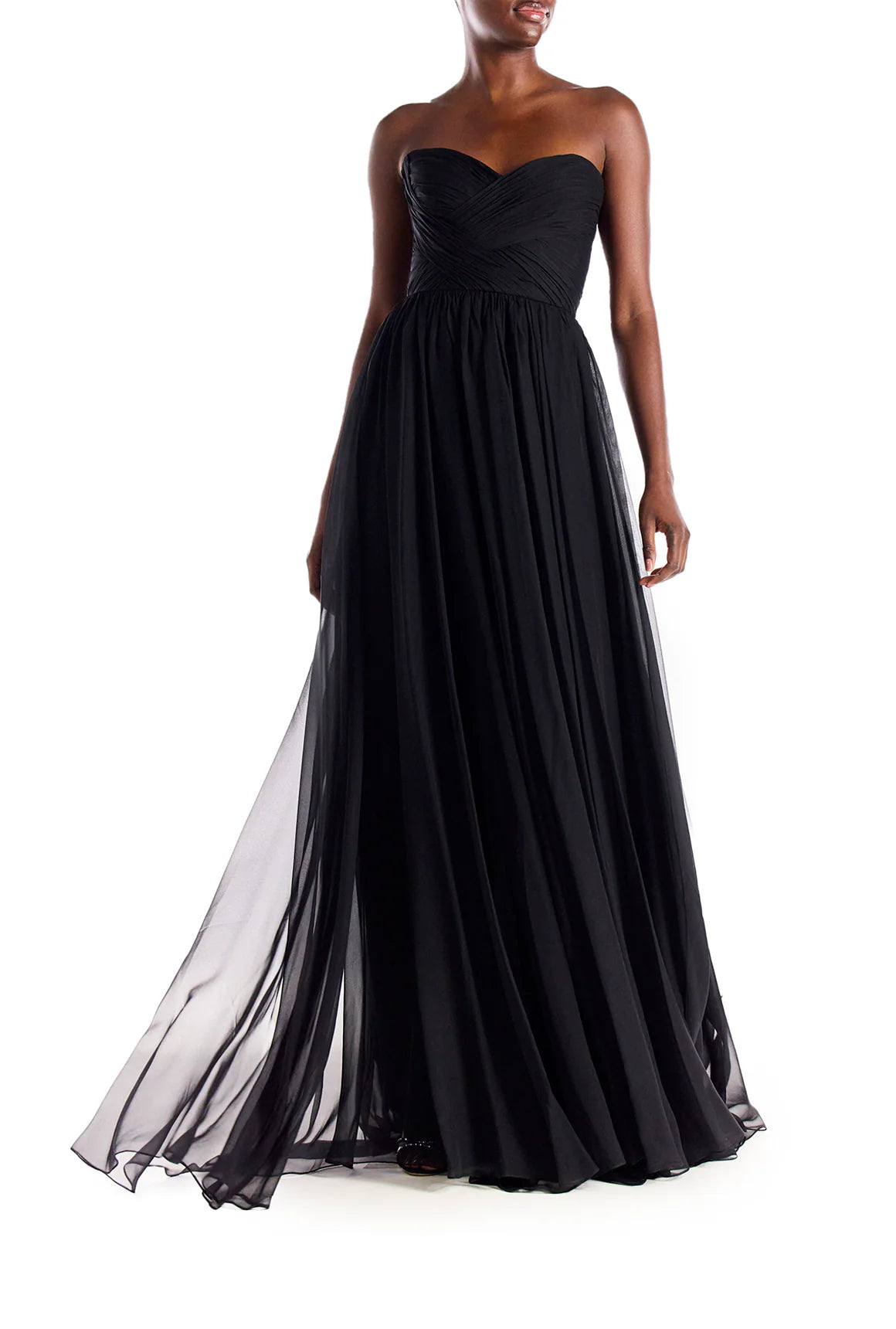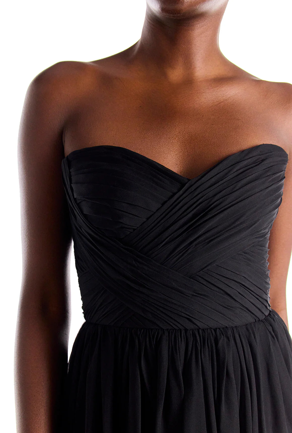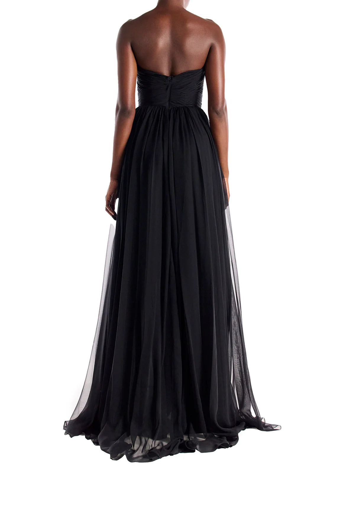 Our Strapless Draped Chiffon Gown in Noir exudes effortless romance. Light boning offers soft structure to the draped bodice. complemented by a sweetheart neckline. Chiffon is expertly draped in different directions. sculpting the bodice and continuing seamlessly onto the back. The skirt gathers slightly at the defined waist. adding subtle volume. while a hint of a sweeping train finishes the back hem. Pair with the coordinating Chiffon Cape (sold separately) for a truly breathtaking ensemble.