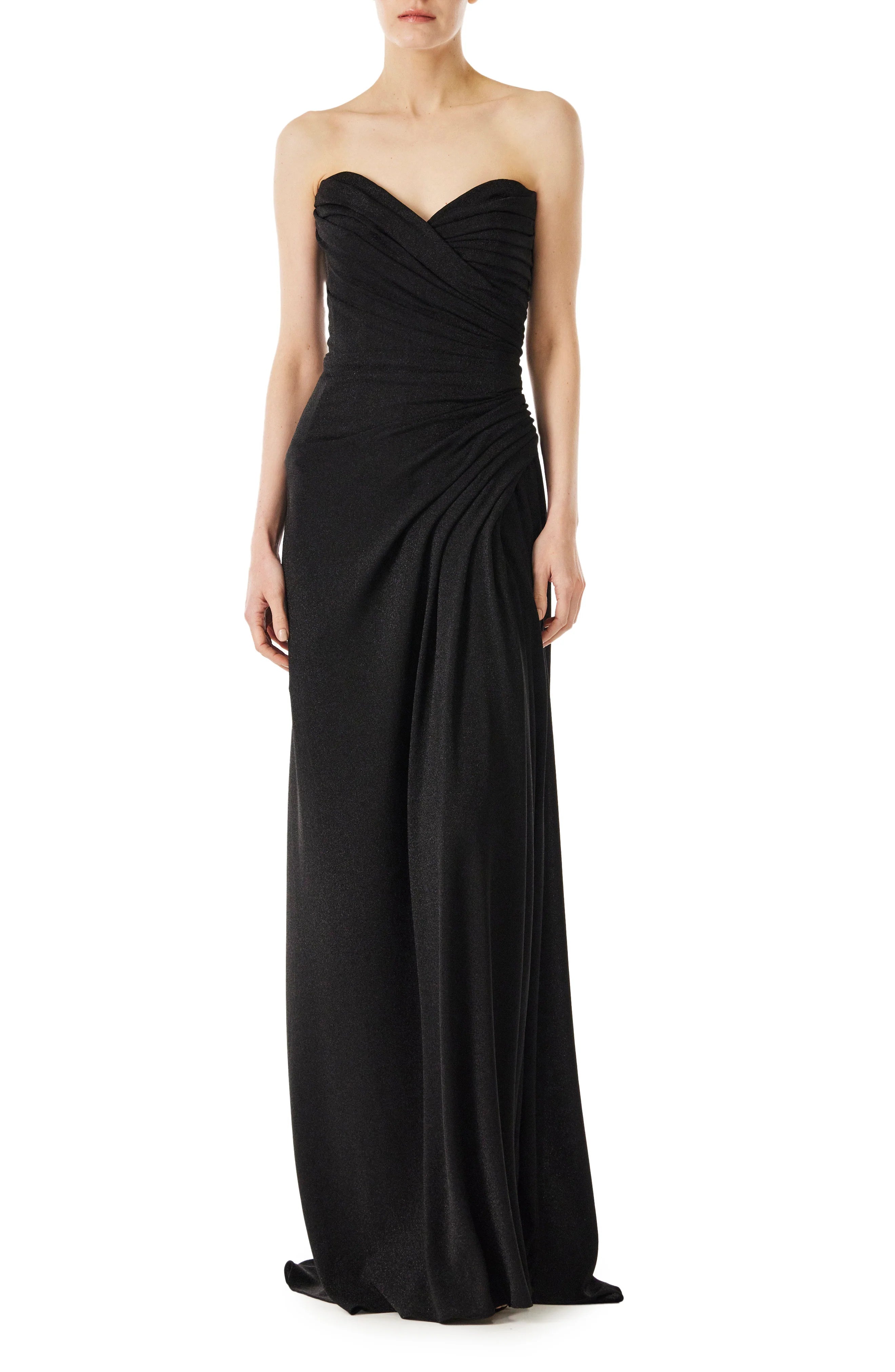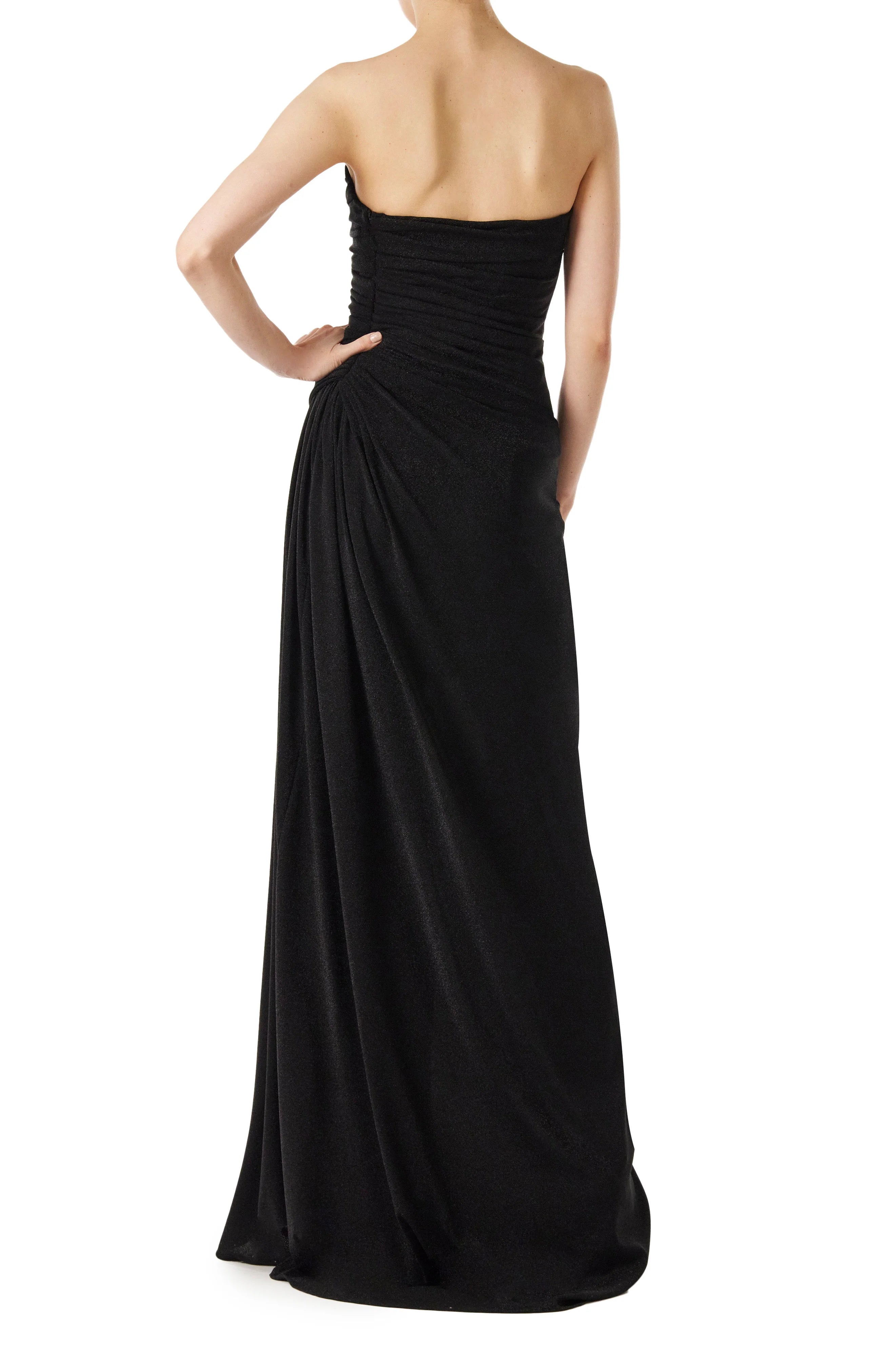 Our Strapless Glitter Knit Gown in Noir blends architectural structure with soft draping. The corseted bodice. reinforced with boning. features a sculpted sweetheart neckline. while artful pleating sweeps diagonally from right to left. gathering at the hip for a flattering. contoured effect. A high slit adds movement and drama. enhancing the gown's sleek silhouette. while the glitter knit fabric offers stretch. allowing this design to hug the body with ease.