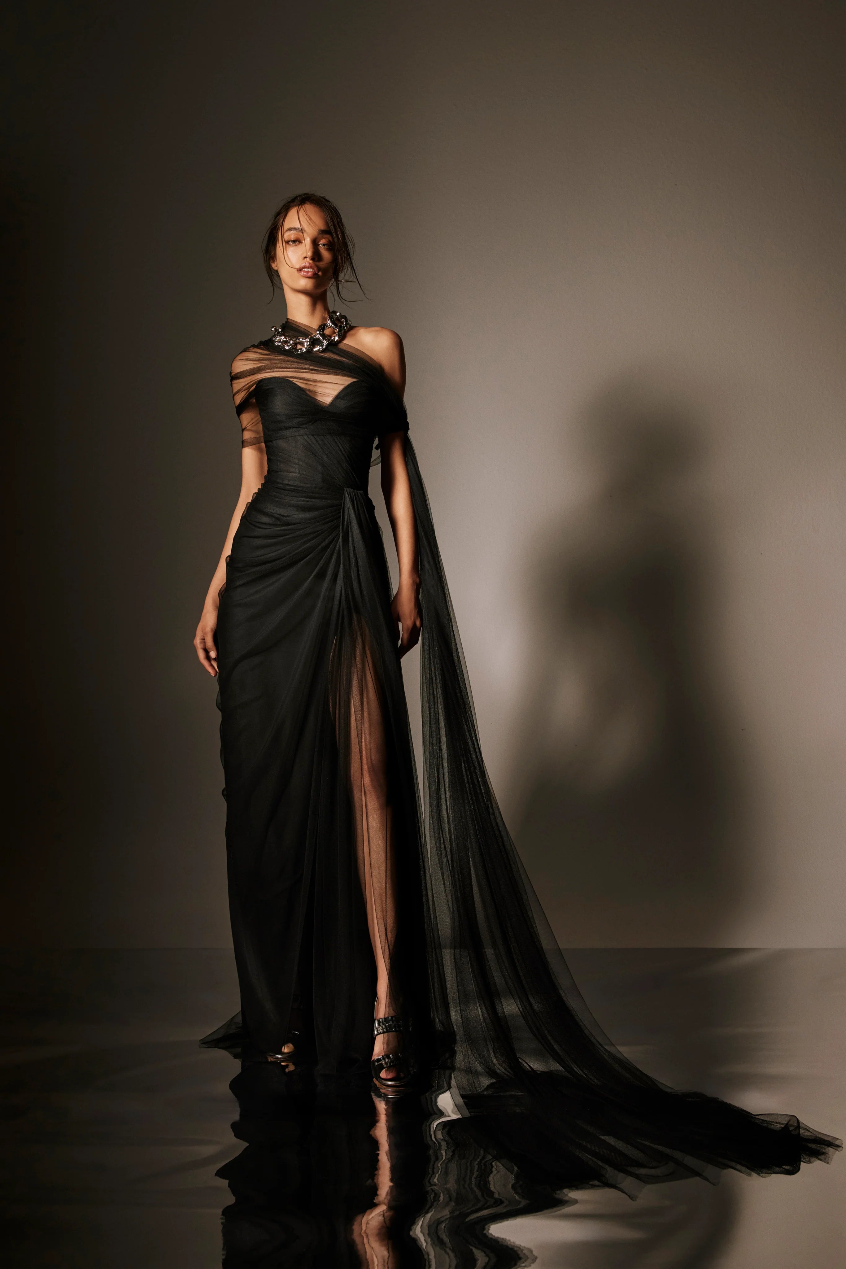 Elegant and sculptural, our Noir Strapless Tulle Gown features a detachable wrap with flowing streamers, crafted in soft Spanish tulle. The bodice, constructed with underwire boning, provides structure and support, while the expertly draped fabric sweeps from right to left, meeting at the waist before opening into a front slit. Architectural construction and the delicate tulle overlay create a striking contrast, evoking a statuesque yet ethereal silhouette.