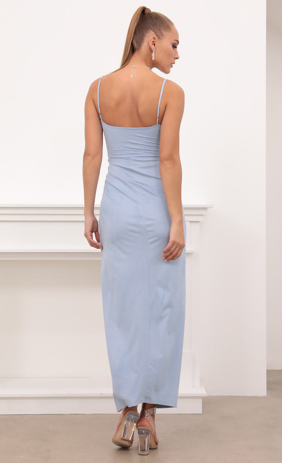 Strut your stuff in this stunning maxi dress! Made in our dreamy light blue suede fabric. This show-stopping piece features adjustable lace-back straps and a sexy high slit. Pair with crystal earrings and high heels and you'll be catching everyone's eye! Made in Los Angeles - Adjustable Straps - Velvet Fabric - Zipper for Closure - Flirty High Slit Length of Dress Measures 57in/144.7cm. All Measurements Are For A Size Small