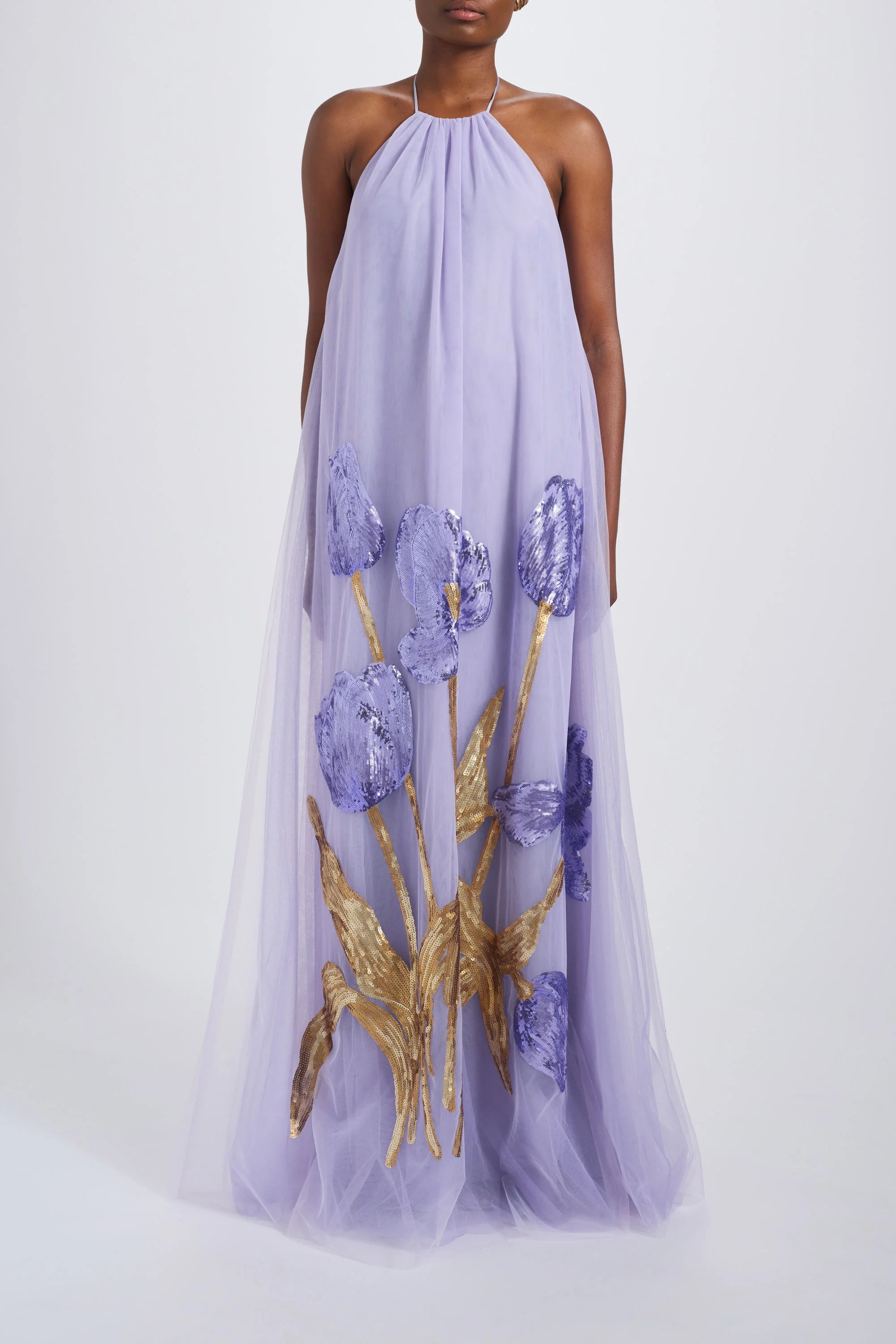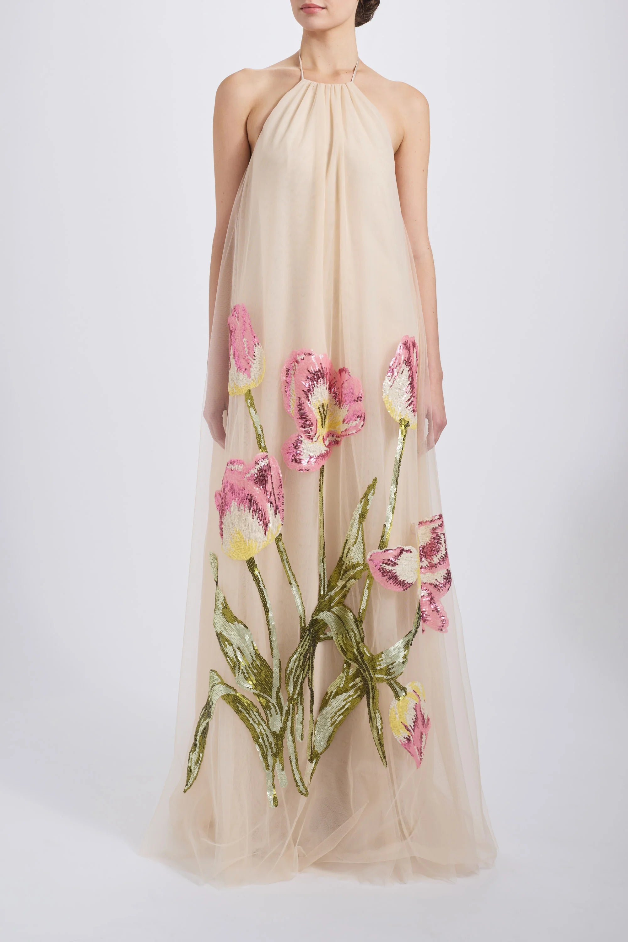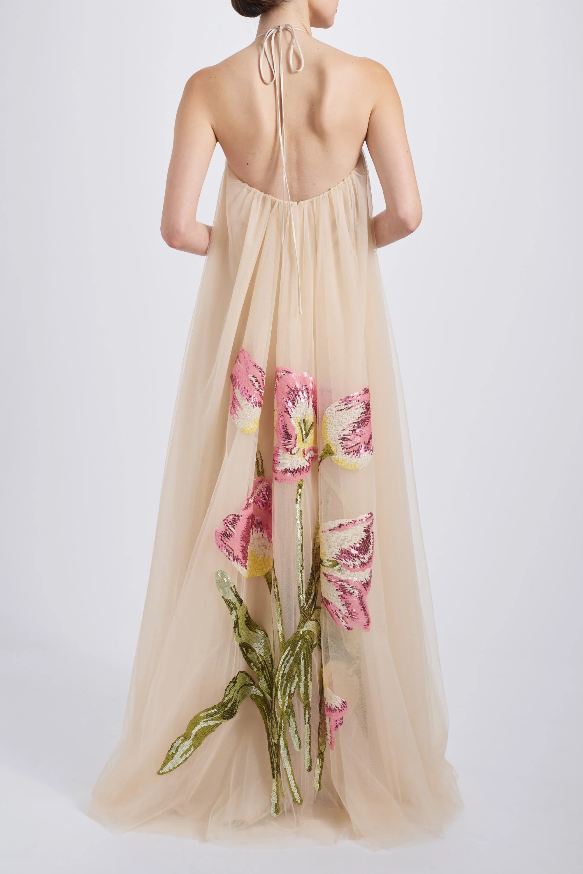 Tulle halter trapeze gown with oversized tulip sequin appliqué.