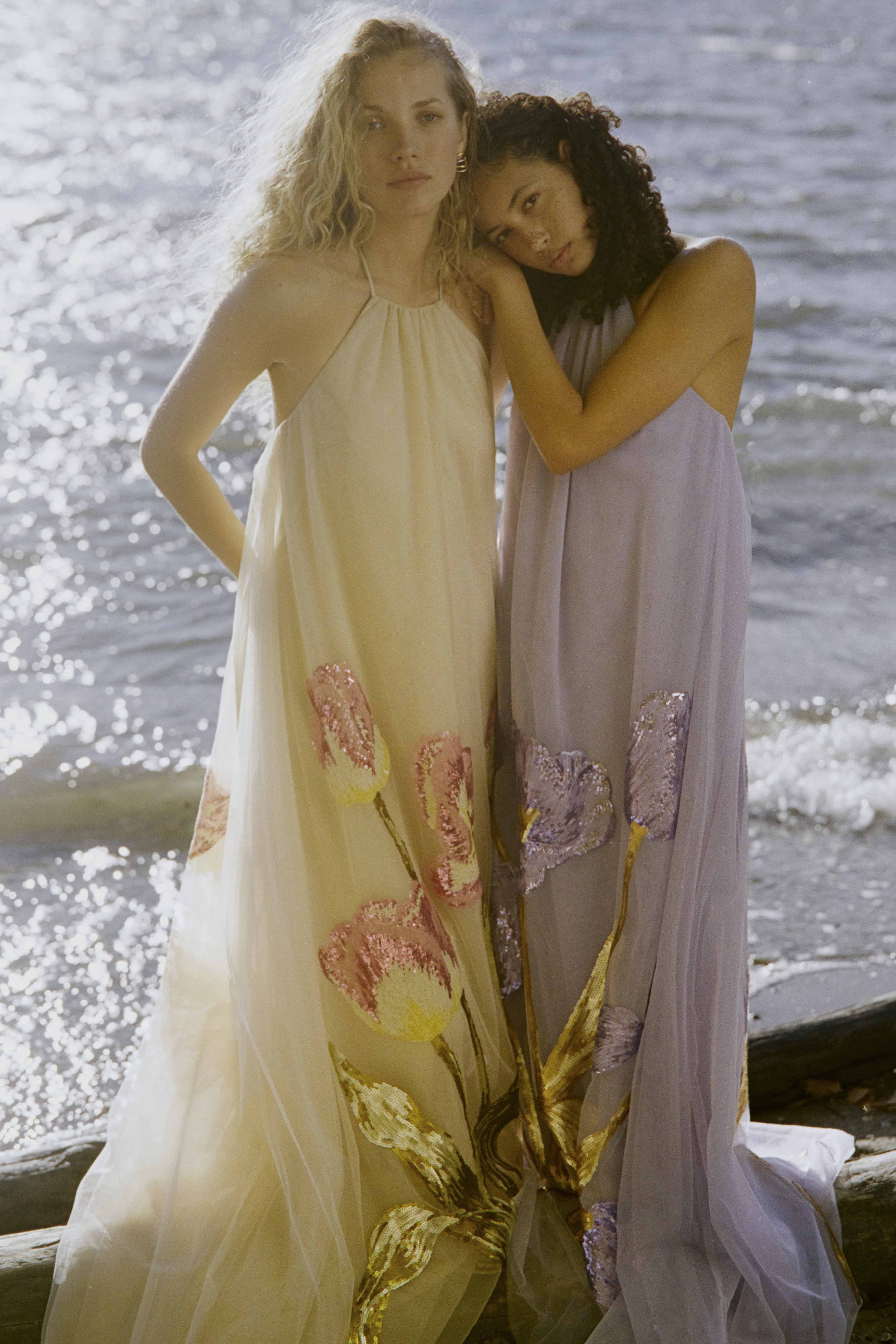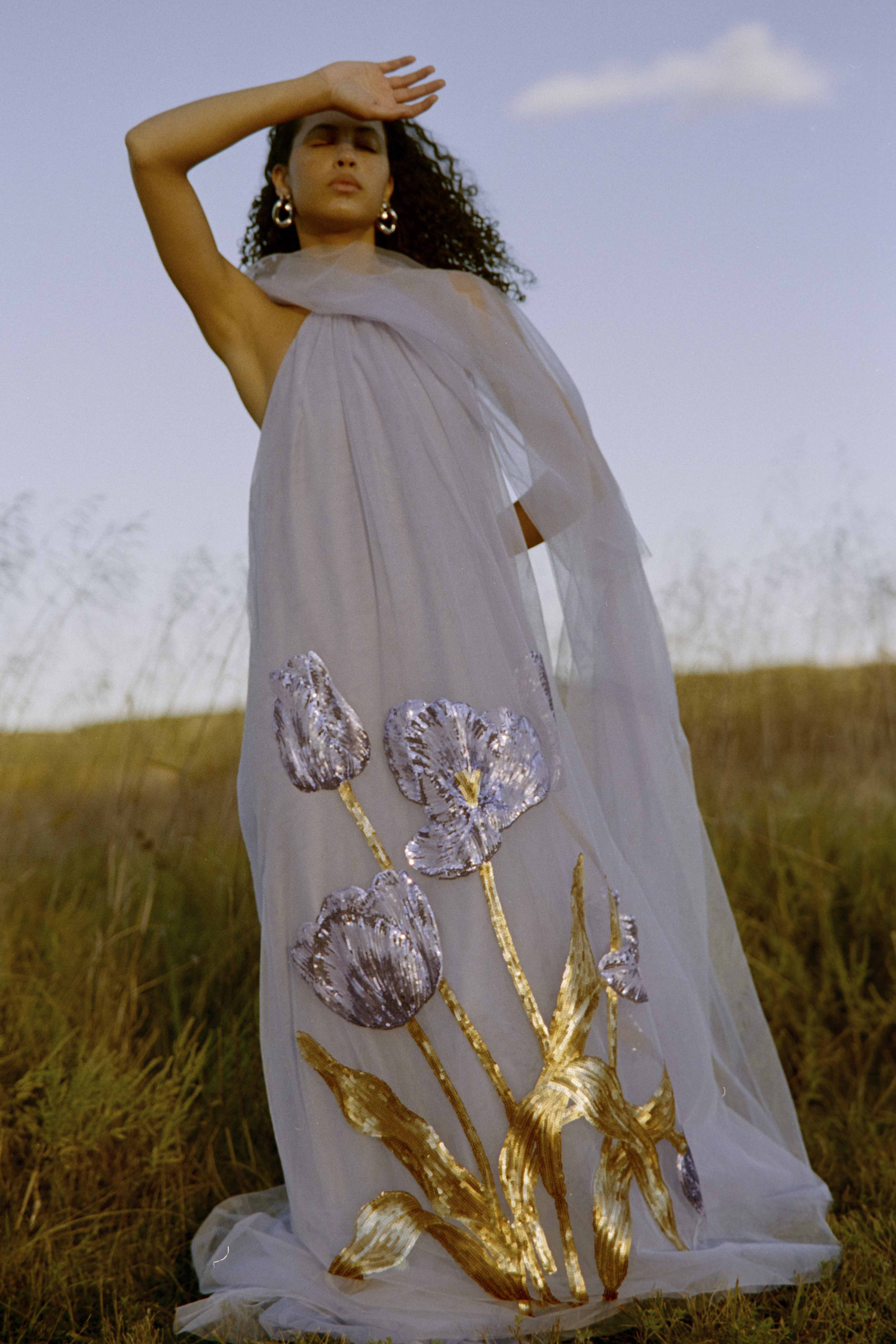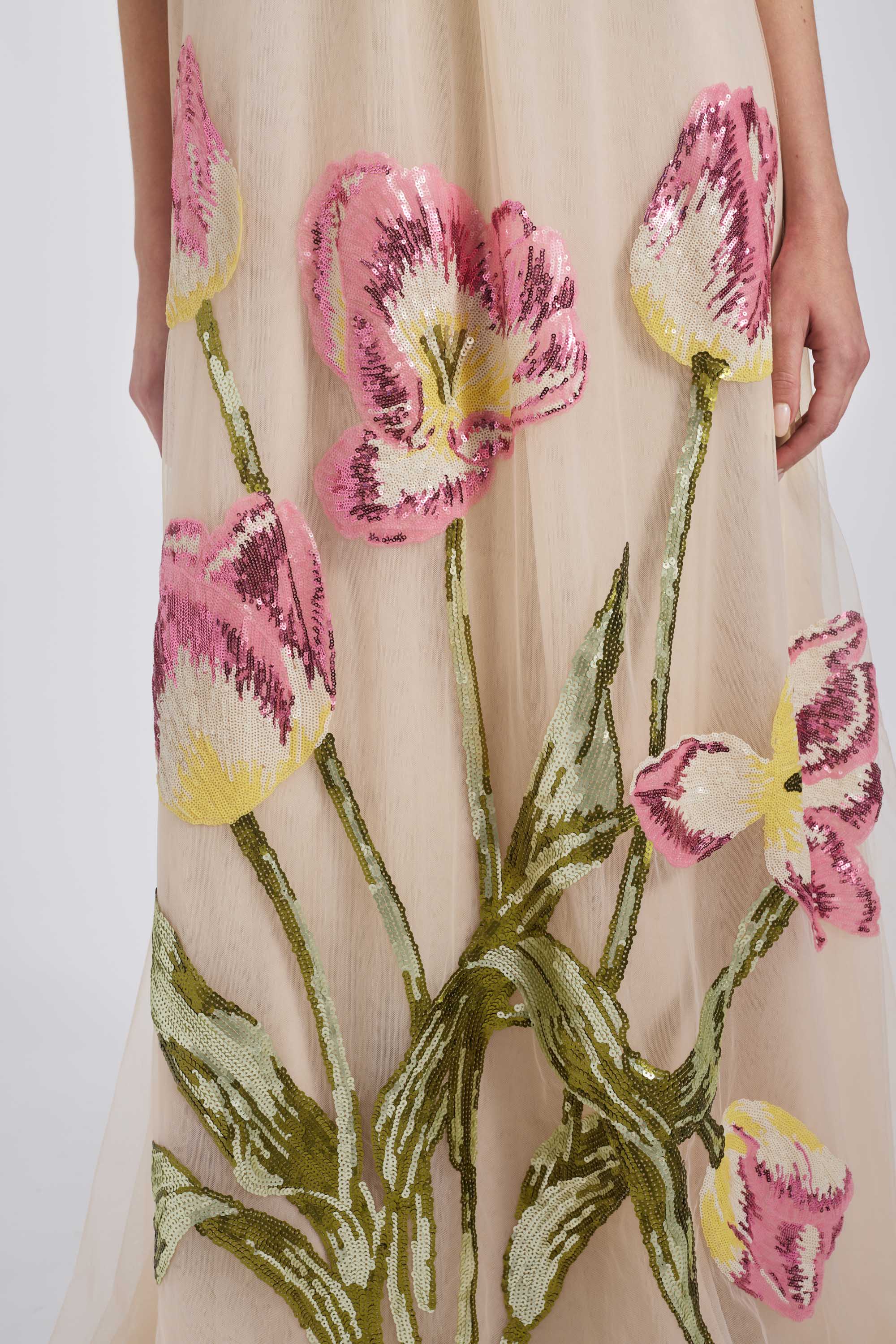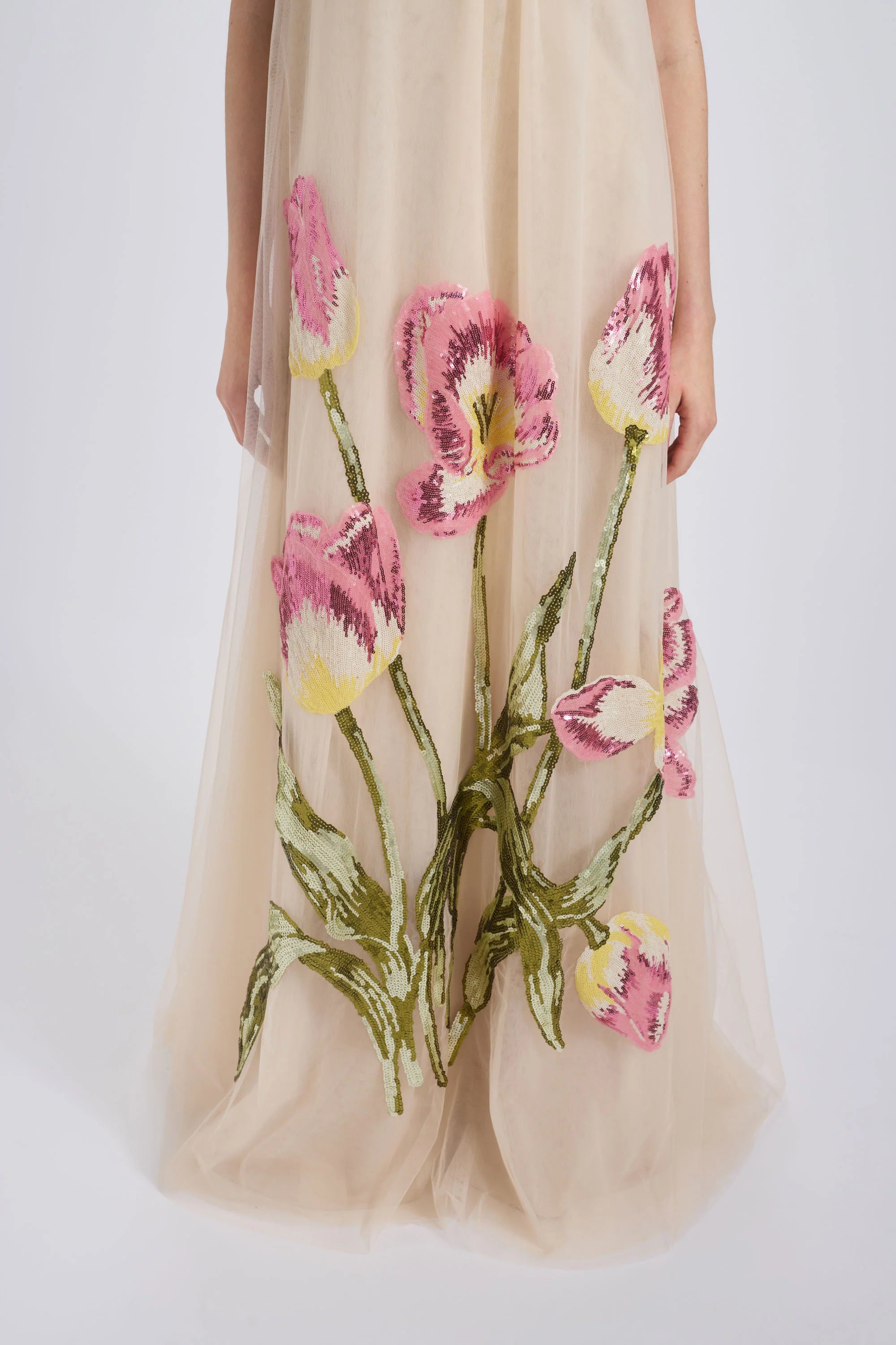 Tulle halter trapeze gown with oversized tulip sequin appliqué.