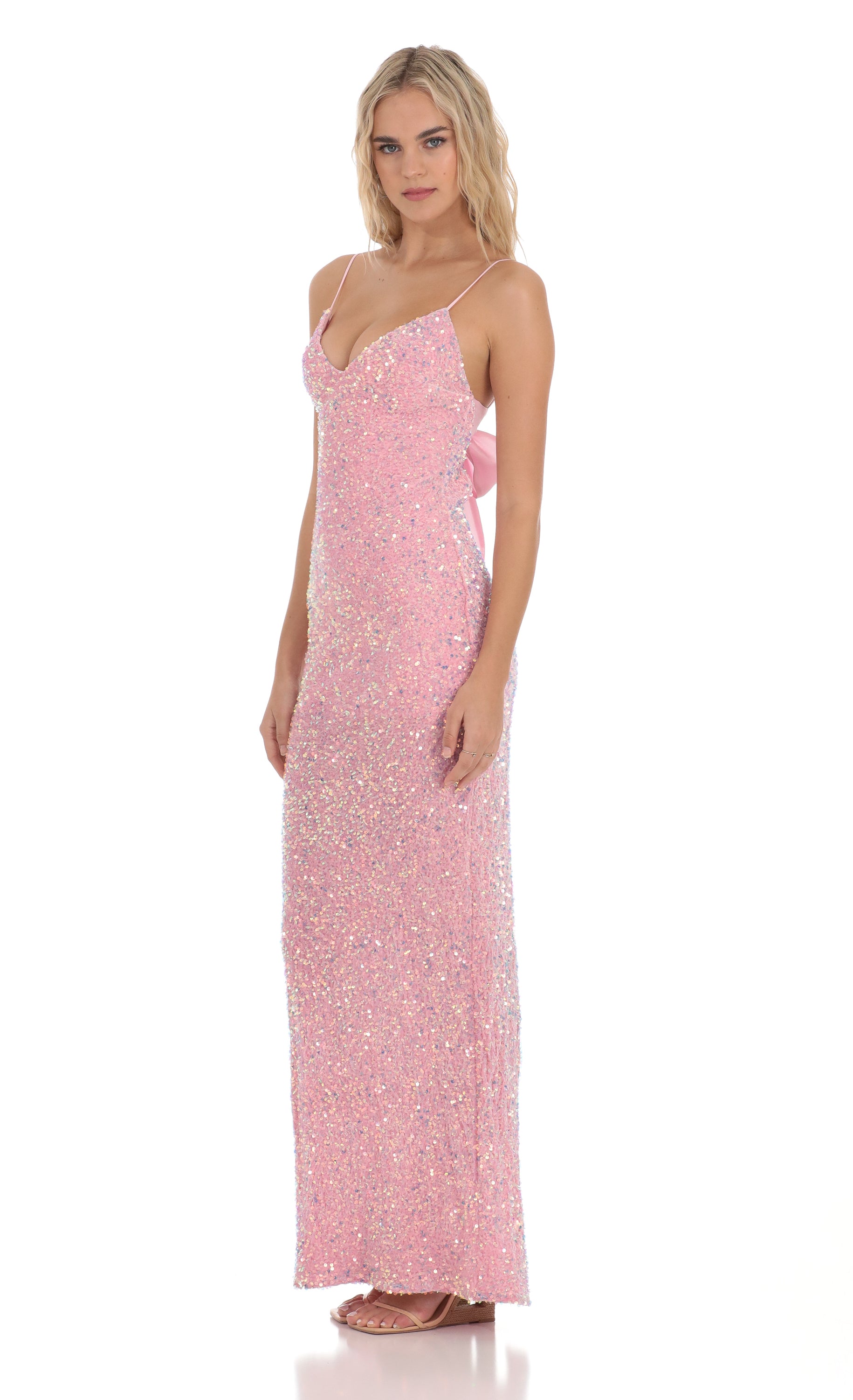 Designed in Los Angeles - Maxi Length - Pull-on with back tie closure - Adjustable straps - Partially lined - Made in velvet sequin fabric - Hand wash cold Model is wearing a size small that measures 57in/145cm in length Slight modifications might be made to improve garment quality. Handling the garments with care, hand-washing and air-drying is strongly recommended.