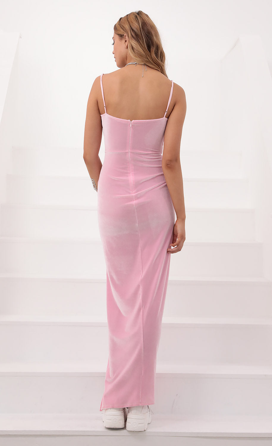Strut your stuff in this stunning maxi dress! Made in our dreamy light pink velvet with a luxurious shine. This show-stopping piece features adjustable lace-back straps and a sexy high slit. Pair with crystal earrings and high heels and you'll be catching everyone's eye! Made in Los Angeles - Adjustable Straps - Velvet Fabric - Zipper for Closure - Flirty High Slit Length of Dress Measures 57in/144.7cm. All Measurements Are For A Size Small