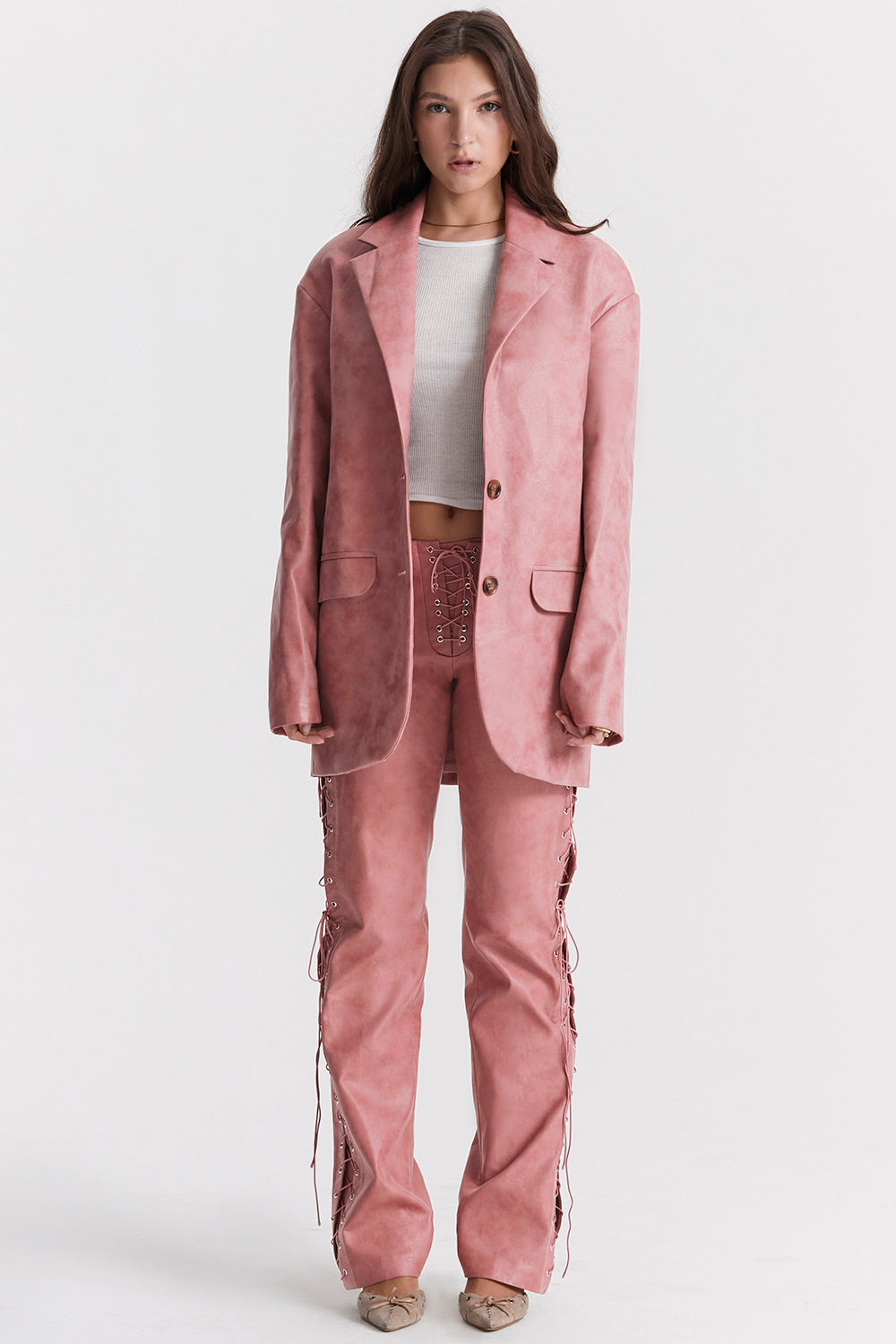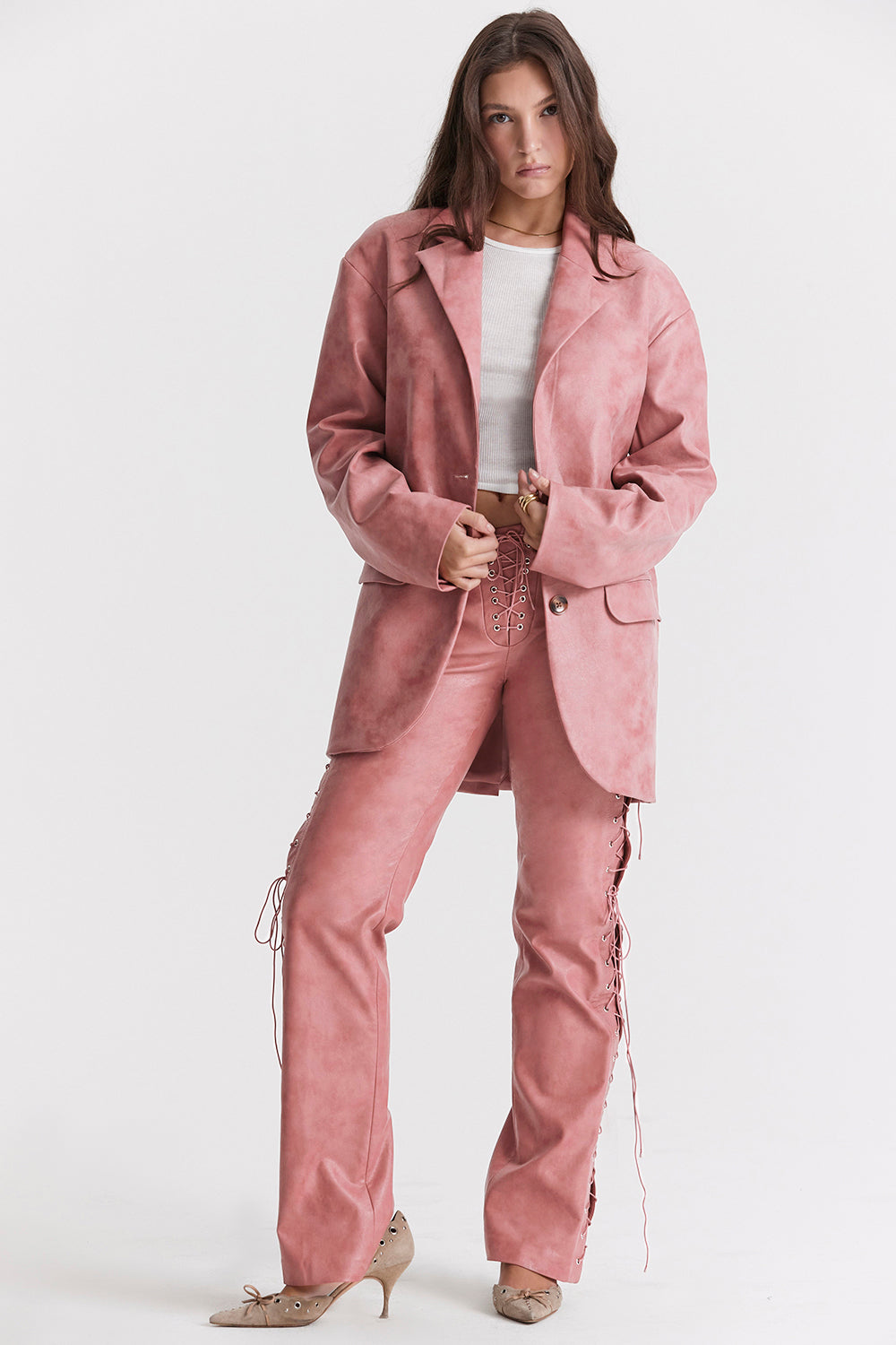 Our 'Keira' blazer is beautifully cut from our soft and supple distressed vegan leather and the classic design makes it especially versatile. We love the warm pink hue to welcome in the spring season and it has a relaxed, oversized shape that's perfect for layering.