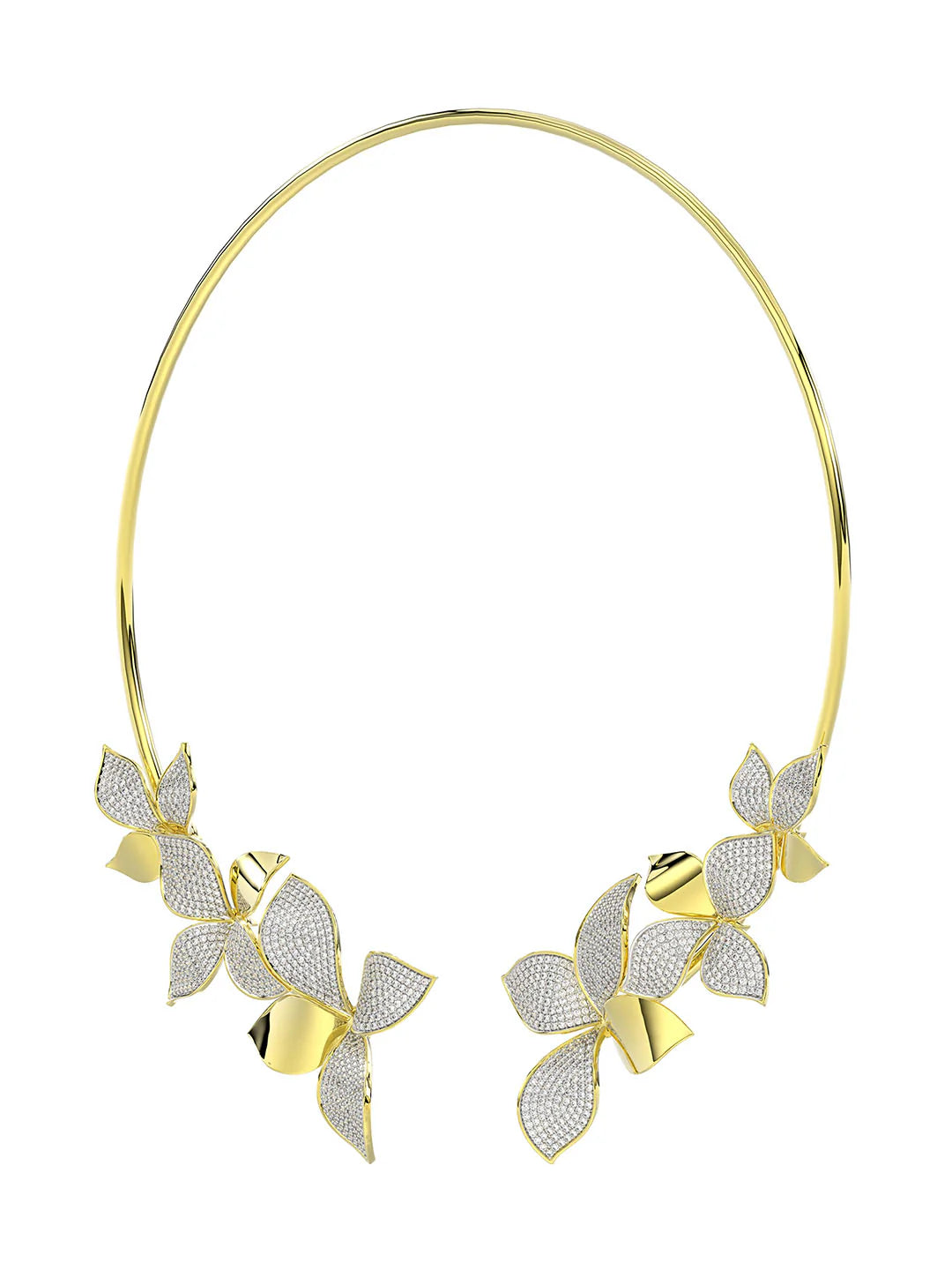 The Wild Flower Yellow Gold Necklace is a solid yellow gold open collar adorned with dynamic teardrop-shaped diamond and yellow gold flowers at either end.