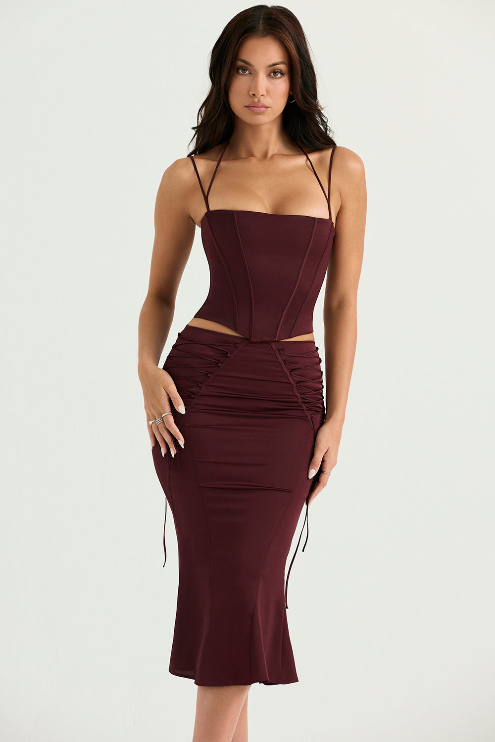 Our 'Sidonie' skirt is cut from the softest fluid satin in a wine hue that creates a beautiful drape from the knee. 'Sidonie' sits on the high hip for a flattering and comfortable feel and we especially love the lace up detail to the front for an ultra feminine touch. It has a zip to the back for easy on and is fully lined for comfort. Wear yours with our 'Chantelle' corset in wine to match the fit and dainty heels.